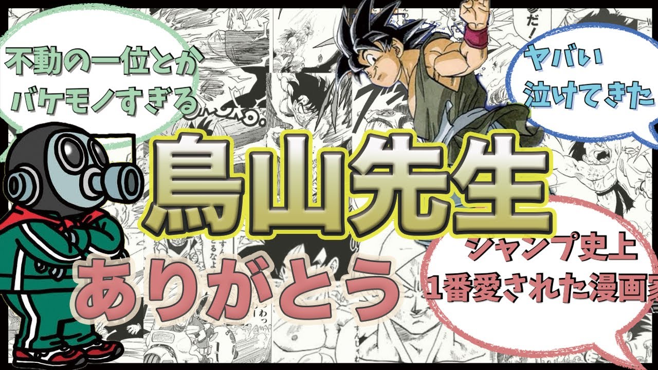 です髪の石を継ぐも僕の後継者と言わせる ほどなんだぜ実は手塚お先生は宮崎はお などの才能あるライバルが現れた時嫉妬 するほど厳しくストイックに漫画に励むが そんな先生が鳥山先生のイラストを見た時 素直に負け認めてしまったことは鳥山先生 の伝説的エピソードとして今でも語り継が れてるんだ私からはどっちも神様すぎて 基準がよく分からないわさらにサイコパス おじさんでおなじみの岡田敏男先生も鳥山 アのイラストは基本的に線が単純で デフォルメに近い画風ではあるのにその中 にしっかりとリアルな要素も入れていると いうことこのデフォルメとリアルの両立 こそが鳥山アのイラストの唯一無の特徴で ありこれまでのイラストを過去にした画期 的な要素と絶賛昔アニメーター目線でも やっぱり鳥山先生の絵は他と違分かってた のね他にもハンターハンターの戸先生や 徐々の奇妙な冒険の荒木彦先生他多くの 漫画家が鳥山先生の力を絶賛してるぜ魅力 的なイラストを残してきた鳥山先生だけど その力で日本の漫画イラストのレベルを たった1人で引き上げたってことねさっき も言ったがこの漫画340年も前の漫画な んだぜ信じられるか確かに今から連載され ても違和感ないしなんなら今でもジャンプ の表紙飾りそうね最後に鳥山先生について 詳しく紹介していくぜたくさんの伝説を 作っているからね鳥山先生は1955年4 月5日生まれの漫画家でありデザイナーな んだ鳥山先生の代表作でもある漫画 ドクタースランプやドラゴンボールは もちろんゲームドラゴンクエストシリーズ のキャラクターデザインの仕事もしている んだこれ1人の人間がしているとかこれ だけでも伝説だわこれだけではないぜ黒の トリガーや桃太郎伝説のメカボンビも鳥山 先生のデザインなんだぜえ小学生じゃ必ず 見るやつは全部鳥山先生が絡んでいるのね そしてドラゴンボールだが実はドクター スランプのアイデアが突きかけていたこと かから鳥山が連載を終了したいと申し出た ことがきっかけとなって作られた作品なん だそうだえドクタースランプってエンマ 完結じゃなくてそんな感じで最終回を迎え ていたのああドクタースランプもかなり 人気漫画だったことから簡単に連載を終了 させるわけにはいかなかっただが鳥山先生 はもう限界で連載を終わらせたがっていた だから連載を終了し3ヶ月後に新連載を 始めるならやめてもいいという条件で編集 部に認めてもらいその信連祭として ドラゴンボールが始まったんだぜさっきも 言ったが当初は人気が今一だったがラグ