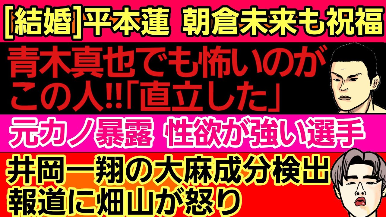 〇平本蓮 結婚。朝倉未来も祝福〇青木真也でも怖い人&ONEに求めてる契約が判明〇性欲が強い選手〇元谷友貴 YouTube開始〇井岡一翔の大麻成分検出処分に畑山が怒り〇細川バレンタイン〇王者 詐欺被害