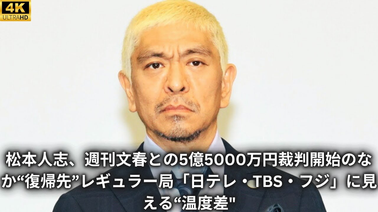 松本仁週刊文春との5億5000万円裁判 開始の中復帰先レギュラー局日テレTBS 夫人に見える温度差女性に男女の関係を 共用したなどと週刊文春に報じられた ダウンタウンの松本仁60が発行元の文芸 春USなどを相手取り5億5000万円の 損害賠償や訂正記事の掲載などを求めた 裁判の第開高等弁論が3月28日に行われ 大きな話題になっている松本が出定する ことはなかったが上で松本は記事に登場 するA子さんB子さんの特定を要求2人の 指名芸名住所青年月日携帯電話番号 LINEアカウントを提出することを文春 側に求めAしb子さんが分からないから 反論できないなどと主張文春側は拒否し それが波紋を広げている第1回高頭弁論は 5分で平定次回は6月5日にで行われる ワイドショ関係者は言う裁判は始まった ばかりですがxqTwitterでの生命 や一連の報道でもそうですが松本さん再度 からはできるだけ早く復帰したいという 思いも伝わってきますよね松本は3月25 日にエイクスを更新して人を笑わせること を心ざしてきましたたくさんの人が自分の ことで笑えなくなり何1つ罪のない後輩 たちが巻き込まれ自分の主張ははかき消さ れ受け入れられない不条理にただただ困惑 し悔しく悲しいです世間に真実が伝わり1 日も早くお笑いがしたいですダウンタウン 松本仁と思いを綴った自身がお笑いをやり たいというのが1番だとは思われますが 番組関係者や高配芸人スタイリストや メイクなどの周囲の関係者の仕事が減っ たり失ったりしている状況に申し訳ないと いう気持ちもあるはずですただテレビ局が はずっとは待っていられないというのが 本音なんですテレビ不教で在のテレビ局に は余裕がないダウンタウンの松本さんの 番組だからCM出航していたという企業も 多くあります松本さんの復帰の目途が立た ないとなるとスポンサーを降りてしまう 企業も出てくるでしょう裁判の決着までは 3年はかかるのではという見方もあります よね全道松本が裁判に注力するために芸能 活動を止たのが1月8日松本や ダウンタウンが出演する番組は代理MCを 起用する松本不在のまま続けるなどの対応 に追われた民法企局関係者は話す松本さん の活動休止からもうすぐ3ヶ月が経過し ますがテレビ各局には温度差が出てきて いるんですテレビ朝日は系列局のABC テレビ制作のM1グランプリがあるものの ダウンタウン松本さんのレギュラー番組は ありませんから特段変化はないでしょう ABCで制作放送されている探偵ナイト