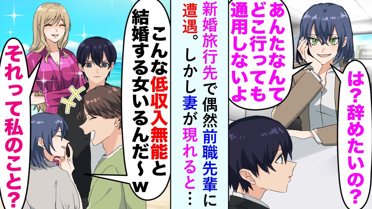 【漫画】俺をバカにしていた前職の女上司に新婚旅行先で再会。女上司「こんな低収入無能と結婚する女いるんだ~w」妻「それって私のこと?」俺の妻の正体を知ると顔面蒼白になり…【恋愛マンガ動画】