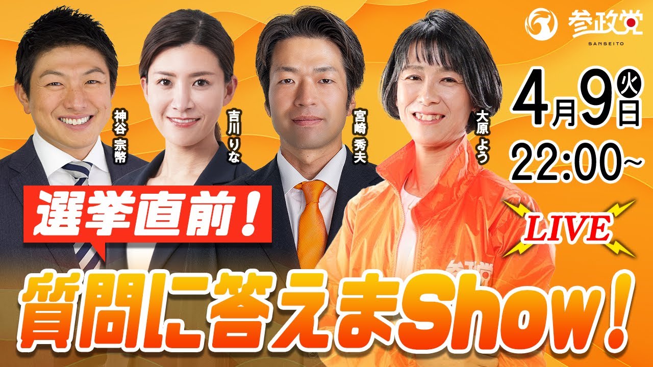 【参政党Live】選挙直前!質問に答えまShow!令和6年4月9日(火)22:00~