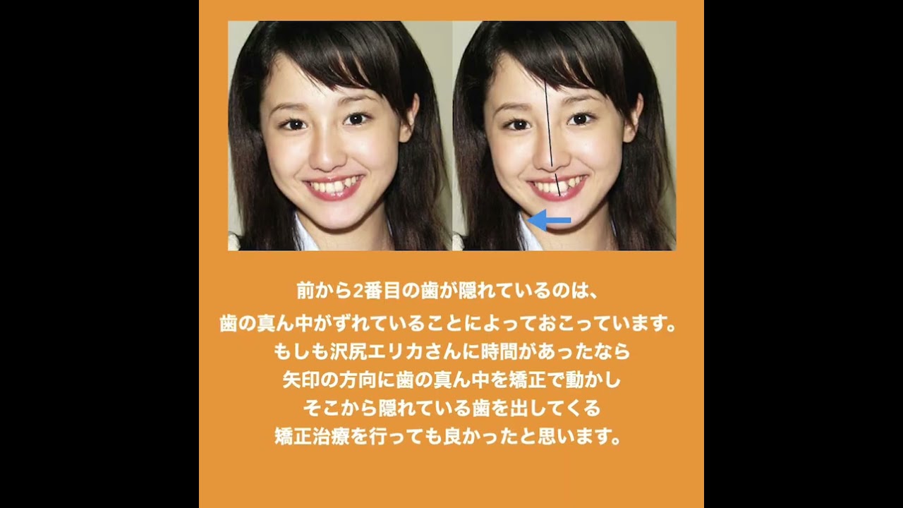 もしも沢尻エリカさんに時間があったなら矢印の方向に歯の真ん中を矯正で動かしそこから隠れている歯を出してくる矯正治療を行っても良かったと思います。