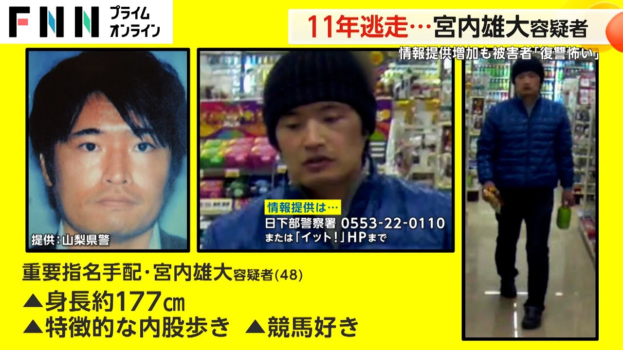 山梨県警捜査一課・磯部啓司次席「現在でも県警察が一丸となって、宮内雄大の逮捕に向け、新たな捜査手法で追跡捜査を行っております。逮捕に向けた情報提供をよろしくお願いいたします」