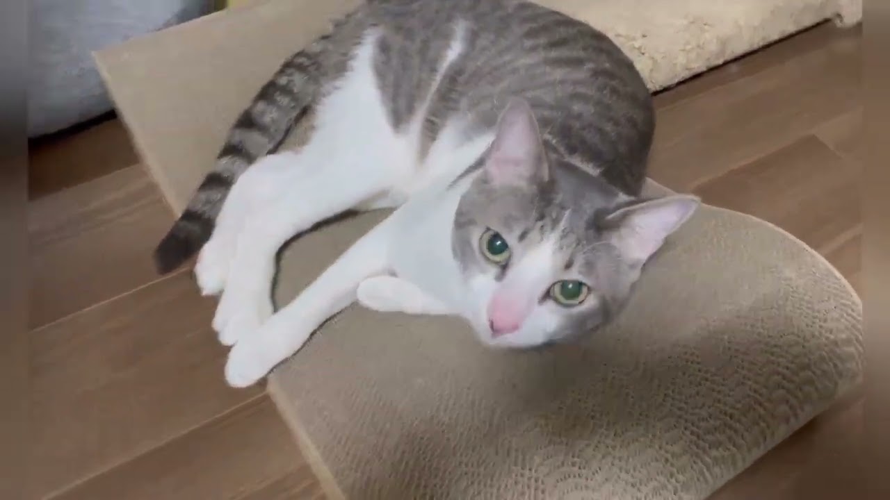 爪とぎがボロボロになってきたので新しいのを出しました アッシュくんは古い方でよく爪をといでます 新しい爪とぎはほぼベッドになっています かわいいです