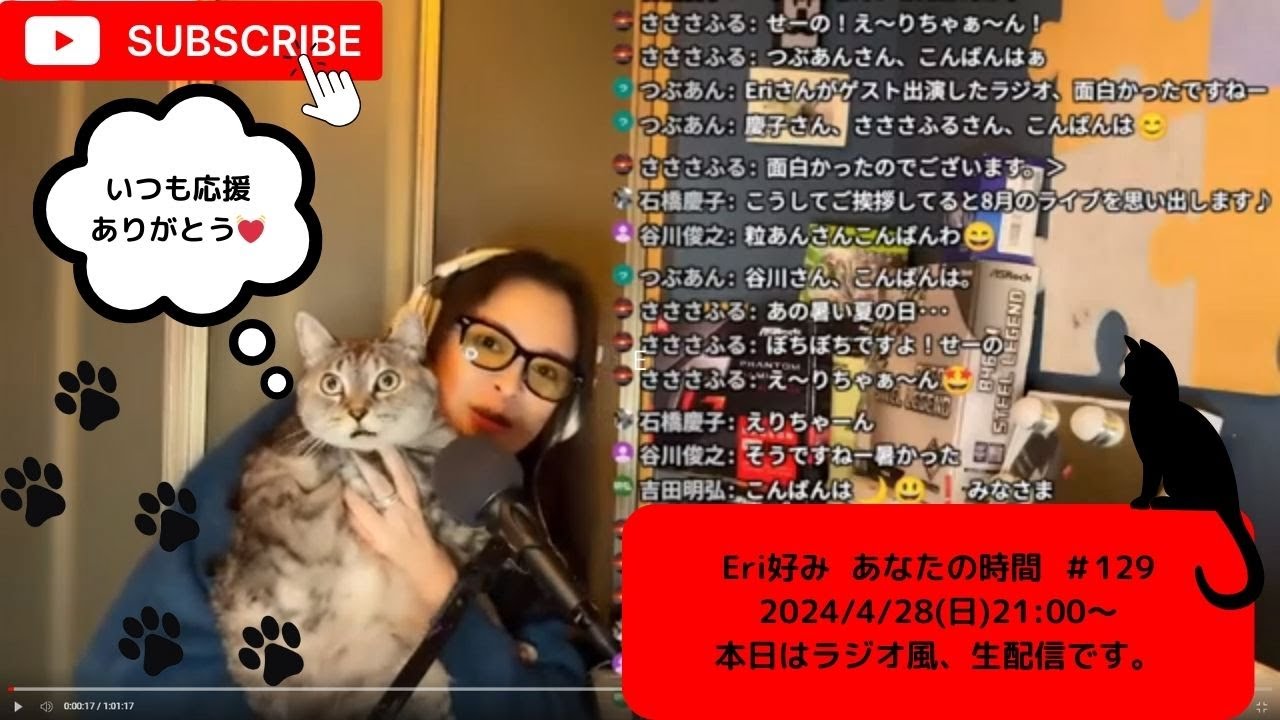 [音楽] [音楽] 流れる景色に持たれて [音楽] ば耳を塞ぐか 止められ [音楽] ない伸ばした腕 の 行を 探し て歩きつかれても戻れ [音楽] ない昨日のこと が嘘に変わって く夜 の涙 や 激しい切なさも今の 私からは消せ ない1人だけ あの時のそのまま で1人 だけ明日の夢を見 てるそれは [音楽] [音楽] 肌に焼きついた ぬくもり を拭うこと なんてて気はしない けど私は 私自分 で息を吸い歩き出さなければ 悲しくなる から2人 きり少したの 時間 も2人 きり求め続けてけ ばそれ [音楽] は果てない [音楽] [音楽] 1人 だけあの時のそのまま で1人 だけ明日の夢を見 てる伸ばした腕の 行 [音楽] なら分かってる でしょうその場所は [音楽] こんばんはえのぼりえりですえり好み あなたの時間129回目え今日もえラジオ 風にえお届けしようと思いますえっと本当 に久しぶりのえYouTube生配信と いうことで えっと随分小さをしてしまってえ申し訳 ございませんでした えっと実はえ3月え 3そうね3月の末ぐらい にあのお誘いをいただいた あのところで新しく生配信を始めており ましてそれの準備とかあの色々やっており ましたところちょっとおろさおろかになっ てしまったんですけれども あのあありがとうございますそうなんです あのそのコムというねえサイトの要するに あの受けと受け取っていただきたい感覚と してはあのま所属したってことじゃない でしょうかコムにえそうですね私が1人で 全部やYouTubeは私が1人で全部 やってたんですけど も例えば あのいろんなサポートをそのコムの スタッフの人が手伝ってくれたりしてでえ スケジュールを立てたりえミーティングま 会議ですね会議リモートなんですけども コムの社長があのさじさんとおっしゃるん ですけれど もあの九州に住んでらしてえご家族4人で あののえうちの息子の1歳年上というね 非常に年の離れた方と今お仕事ををえ しようとま1回目先週の日曜日終えた ばかりなんですけど もとってもね あのサポートが 手厚くしていただいたのでう思う存分あの 歌って騒いた2時間だったわけなんです けれども私それであのセッティングをねあ えっと生配信をする場所がお家じゃなくっ てあのうちの近くにあるリハスタを借りて あのそこで大きい声でお腹から声を出す 感じでっていうイメージ で1回目やりたかったのでえっと機材をね リュックサックに詰め込んでコードでしょ アダプターでしょうん電源のねあとま キーボードは あのそうねキーボードはあのスタジオの 備付けのものでねもものでねんで まあれこれれ入れるとパンパンになるわけ オーディオインターフェイスとかマイクと か持っていくと ねであの三脚もあるじゃないでああの私 あのスマホの画面とか全然見えないんで あのiPadでえっと配信してるの iPadから直接配信してコムの画面は iPadで大きく見てるわけだからああの すぐ分かるんだけれどもiPadって結構 重いじゃ ないであらペンがついてたりするからペン はあのペンペンペンペンうるさいけども あのなくしたらまずいからペンは置いてく とかそういうの全部メモってチェックして もういだから出かけてそのスタジオに 向かっちゃったらもう忘れ物とかできない からありえないからもう全部チェック入れ てま去年の8月のライブの時もそうだった んですけどもとにかく忘れ物をしないと いうこととあしっかりお化粧をしようと あとみなりもなんとのうちであのあのあの YouTubeやってる時みたいな感じで はなくちょっとピキッとしたのを着ようっ ていうことを大事にえっと先週1回やり ました とそうそれでそんであの まなんて言ったらいいんでしょうこうまだ 未知数というかまちょっとよくわからない ところは私もいっぱいあるんですけれども そういうのも社長に聞きながらもういつで もあのねLINEするとねすぐ既読がつい てすぐね返信が返ってくるの私みたいに ね何日もほっといたりしないわけすぐ来る からびっくりしちゃってで あの心強くやらせていただいていますあ やらせやらせてもらうつもりでいますそれ をねあこここれ今から1年ぐらいどんな ペースでやるかはちょっとタイミングを見 ながらやりたいんですけどもそうそう4月 15日は さま母の明日でもあるんだけどもゆき ちゃんの誕生日ま仮のね野良ちゃんなので 元ねあの仮に4月15日にしたのね だからねあのね7歳になりましたのうちの うきちゃんでねでもねあのやっぱり飼い猫 になったせいかねすごくね甘えんぼさんと がねどんどん増してねあれ猫って何歳から 老病なのかわかんないけども結構なあの 高齢猫になってきてるから健康には気を つけて要は病院にねえ年一で行くことは もう決めてるんですけどそれは去年から 実行してて歯磨きも始めたんですね奥歯に 跡がついてたからあの病院でもらったあ なんつうのかなジェルあごめんなさい ジェルみたいのを塗るだけでいいんだって そこにで指最初すごいやがったんだけど その後にまた旅がもらえることも知っ ちゃったからあのね時