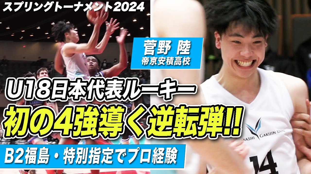 【バスケ】山梨学院大 U18日本代表ルーキーが初の4強導く劇的逆転弾!残り38.1秒から殊勲の一撃 菅野陸 (1年/PG/175cm/No.14/帝京安積) [スプリングトーナメント2024]