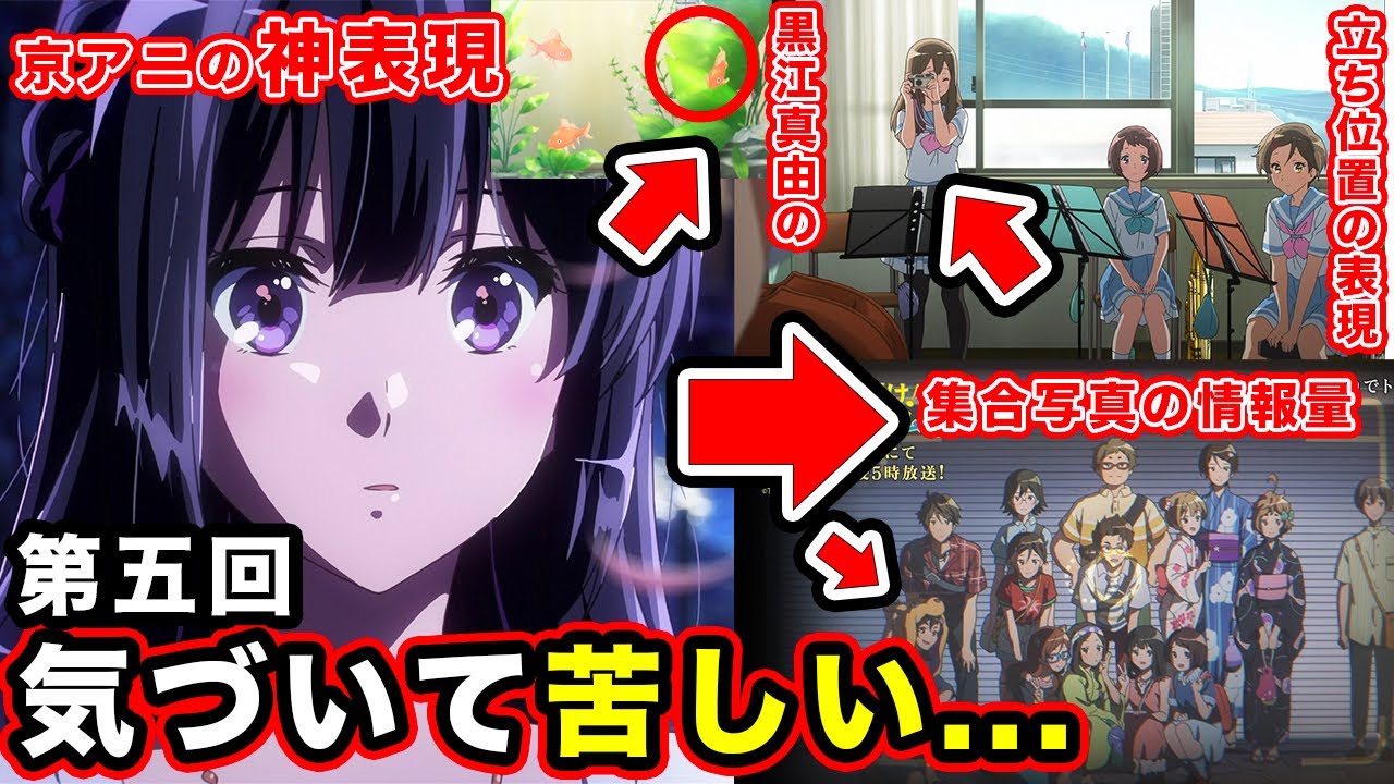 はい今回響きイホニャム第5回2人で トワイライトが放送されましたのでその 振り返りあったりとかここが良かったなっ ていう部分だったりとか気になる点 ピックアップしていこうかなと思いますえ 前回第4話の方第4回の方はま元迎いだっ たんですけれども収支細かい演出と構成で 本当感動したんですがコメントもたくさん いただきまして何倍もね私も楽しめてるん で是非ねコメント欄見て欲しいですえ今回 サンフェスも無事に終わってコンクールに 向けて練習が本格化していくんですけれど も前半はちょっと胸が苦しくなるような こうオーディションに向けての内容が詰ま ていたりとか後半はこう集性のこうキ ポイントもたくさんあったりとか本当に お腹いっぱいの回だったかなと思うんです けれどもこっからもっと不穏になってくる と思うんですけれどもそれでいてこの女性 としてはもかなり素晴らしいエピソード だったかなと思いますそんな第5回 振り返っていこうかなと思います是非皆 さんのご意見だったりとか感想だったりと かここが気になるとかこういう意図がある んだよってあればねコメントで教えて くださいいつもたくさんのコメント ありがとうございます非常に参考させて いただいて何倍も楽しめておりますでは 早速本題に入っていこうと思います冒頭 前回の振り返りからオープですねもう オープニングもねこれ物語が進むごとに こう鳥肌感がこう増してくるというかそう いうオープニングに仕上がってるなと 改めて感じておりますそして最初大系と 行くんですけれどもお父さん久しぶりの 登場ですが金魚お祭りでもらってそれをね それをもらって持って帰ってきたという話 がありますまこの金魚後ほどねちょっと 回収されるというか意味心的な描写で描か れるんですがまずこのシーンではま芝居の 道というところのテレビで流れていてその 流れで大前組子に対してこう進路はどう するのかていう話をしていますでここの コメントもすごい良かったんですけれども まやりたいことがあるなら言いなさいと いう言葉だったりとか悩みがあるなら お姉ちゃんに相談しなさいよっっていう ことを言っていますこれまでのエピソード を知ってる方からすればこの流れの展開と しては思いくみ子的にもすごいいいところ ですし深みが詰まっている言葉だったかな と思います途中ワンカット入ったこう大池 の玄関の様子があるんですが父親の靴って のがまっすぐ向いていて組子の靴が ちょっと曲がっているっていうところが こう進路悩んでいるっていうところが描か れていて細かい描写すごいなと思います そして2人でトワイライトのタイトルで タイトル5なんですけれども進路の話へと 進んでいきますま大前ちゃんめちゃくちゃ 悩んでいるんですけれども問題ではないと いうこう明確なね個体自体はありますま 想像が自分ができないよということでした ねでもちろん高坂レナレイナに関しては 元々音楽のプロというところを目指してい たりとかそういうところがあるしレナほど の心出しがないということからま目標が ないことに疑問を思っているというのが大 まちゃんの今の立場ですで話は変って幹部 会へと移るんですけれどもま オーディションの話へと映っています進路 も大事だけど今はここに大前ちゃん含む 幹部たちがフォカしていることがよく 分かるかなと思いますでこれまでのことを やっぱ思い出すのはオーディションすごい 内容が詰まってるんですがま進路よりも オーディションということがよく分かり ますよねま週1からのね提案として7月に したらどうかということがあるんです けれどもまギリギリにする作戦ですねま 去年よりもいい結果を出すために帰る必要 があるというねこれは本当周一としても すごい答えだと思うしかつこうセラ女子に いた黒い前をですね転校してきたんです けれどもそのセラ女子は競合でありながら 大会ごとにオーディションをしていると いうことが明かされていきますま滝先生の 負担が多くなるよということを言っていた んですけれども滝先生に相談しに行くとま 主体性重視のこのタ先生ですからタ先生は もちろんオッケですただ幹部たちの負担も 大きいよということをタ先生が忠告して いるんですけれどもそれでいてもこの方針 で進むこととなりますま毎回 オーディションすることの不安っていう ところはかなり詰まっているんですけれど もそれだけ前年の悔しさを踏まえた上で 今回向き合っていくということが描かれて いきますでその後このオーディションに 関してのこう説明をするんですけれどもま カピーから質問がありましたねまソロは どうなるんですかということなんですがま ソロももちろんオーディションごとに 変わるよということを言っていました実力 手の北ならも当たり前ででしょみたいな話 でしたでここでこうカナピーが言ったこと まカナピーとねこう黒いまゆって結構対象 的に描かれるんですがここで