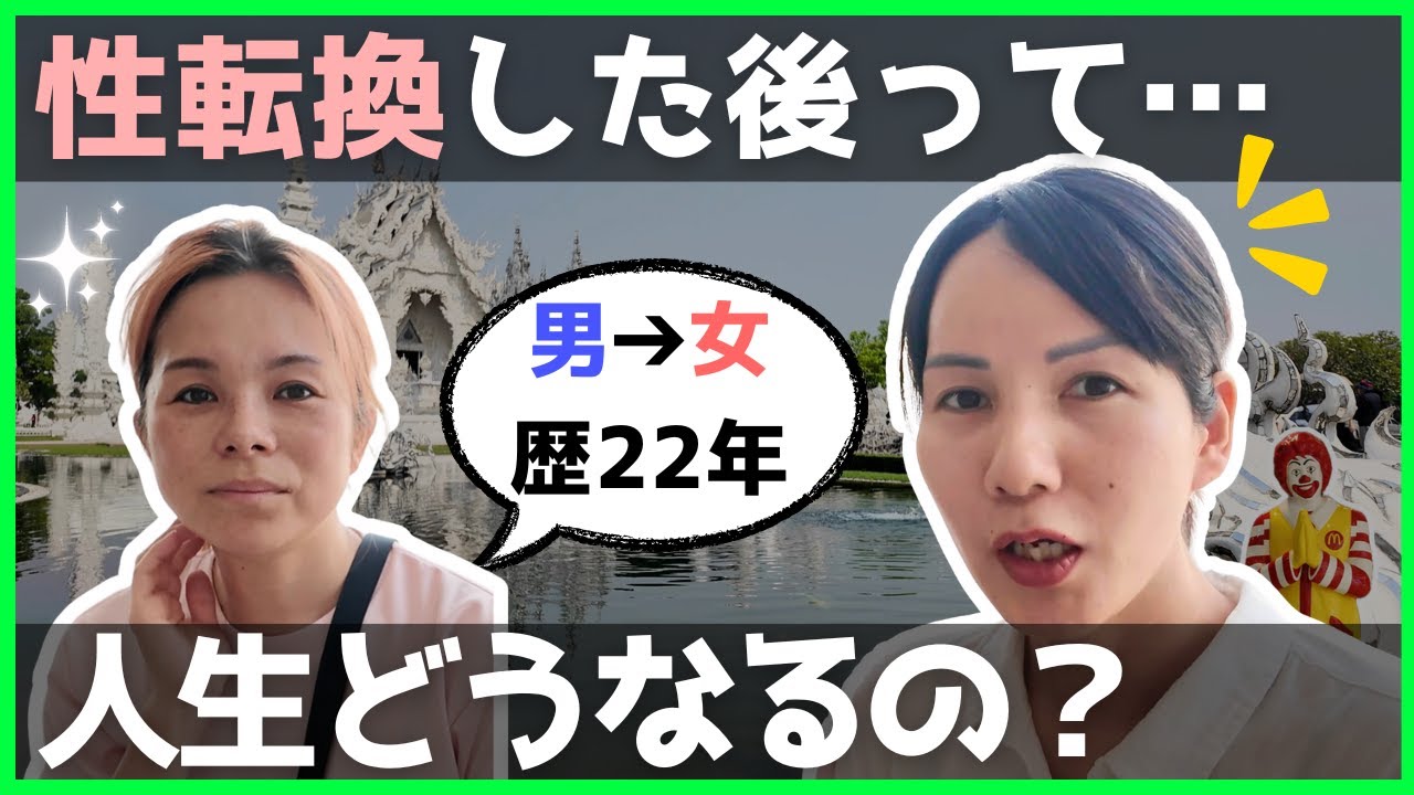 皆さんこんにちは36歳元男性美女を受賞 する痛いネットアイドルのスミーです前回 のパニさんとのコラボ動画はどうでしたか 結構人気で反響も良かったですよ アンケートの結果体観光をもっと入れても 良かったのよという意見もあったので今回 も体観光のネタをちょいちょい挟みますと はいえこの動画の視聴者のほとんどが性別 変更とかに興味ある人なのでその情報も ありますあ最近登録した400名のうち 10%の40人ぐらいはH情報に興味ある そうですがこの動画では今でもこの先も 未来もそういっった情報は出てこないので 今のうちに登録会場お願いしますキモい話 を戻します今回はこのチャンネルでも人気 の美女川上リサさんに旅をしながら セキララインタビューしていきます今回の 内容はざっくり1晴天看護の人生はどう なるトランス女性が世界で旅し続ける理由 2昔と今の性転換事情石を投げられ拒否さ れていた過去と今の時代の変化3男の見た 目を美女にする方法おっぱい包と顔の女性 化リアル体験談がえぐい以上の内容を対 観光しながらお届けしていきます今回は性 転換情報と対観光情報を同時に楽しめる 素晴らしい動画なのですが最後まで見なく ていいんですか動画が長いから寝る前や 作業中BGMとしてリラックスしながら見 てもいいんだぜというわけで本題に行き ましょうリサりんだよって今日はですね なんとリサさんに来ていただいております どうもこんにちはリサですはいリサさんの 詳細はYouTubeのこの辺に概要欄 載ってますけれどもえ前回コラボしたリサ さんとの動画かなり再生されております ありがとうございますマジすかいや ありがとうございますで今日はリサさんに いろんなインタビューをしていきたいん ですけどもまついでにねリサさんタに来て いただいてるということなので観光も ちょっと挟んでいこうかと思います願 よろしくお願いしますよろ願こちらですね バス中央駅っていうめちゃくちゃバカ でかい駅なんですけども今からね出発する 前にお菓子とかね飲み物とかね買っ ていこうかなってとこですね今回は対北部 の都市チェンマイチェンライを観光しつつ フランスビジョンのリサさんに インタビューしていきますチェンマは バンコクから700km離れていて超遠い ので飛行機で行くのがベストしかし今回は 移動も楽しみたいので寝台列車で14時間 かけてチェンマイに向かい ます爽やかな朝ですが今の時期のチェンマ は野焼きの煙がえぐくて外はキャンプ ファイヤーの匂いがしましたアジアで一番 空気が悪くてBM2.5が危険なレベル です朝ご飯食べていきたいと思いますこれ カフェですねカフェラテでホットで65パ めちゃくちゃ高いこれケーキ55パツ まあまあ普通です ね到着いたしました空気がやばいです駅の コナこんな感じで対第2の年チェンマイは 北方のバラとも呼ばれる美しいことです 12世紀頃はランナー王国の首都として 栄え北対独自の文化芸術が花開き今も芸術 の拠点となっています日本人も多い街です 今いるのがここでチマの街の中心地はここ みたいですねお掘りで固められてますねあ に似てるねなんか色々お店があるみたい ですねあたプラトゥタペバイプラトゥタペ が30バースえグラブを呼ぶと47バー かかるんでこれを使った方が安いと思い ます ワイプか [音楽] プラトゥターペーっていうもが有名なもん があるんですけどそこまでの金額が駅前の 表示は30バツって書いてあったんです けどおじちゃんは50バツって言ってまし たでなんでって聞いたら対語で教えてくれ たんですけど全く意味が分からなかったん で自分で勝手に予想するんですけどま おそらく物価が上がってあの看板は昔の 看板だから30バーツて書いてあるけど今 50バーツだよって言ってたのかもしれ ないわからんけどこちらチェンマイで有名 なゲートプラトゥターペーてやつプラトゥ ターペーんプラトゥターペーかなわから ん本の下のタイヤが綺麗できてます ねラスタープラ幅が広いめちゃくちゃ 幅広い壁です この後はリサさんと交流してタの温泉地 メカちゃんへ向かいますというわけで交流 地点のチマバスセンターへ向かう ぜ今ですねチェンマイのバスセンターに来 ましたでリサさんも一緒ですはいそり かここ来るの初めてですかあ割と来てます ここはあ割と来てるんだはいでこれから どこ行くんですかこれからメカちゃんに 行きますメカちゃん可愛いですね誰です かいメカちゃんどんな子か想像してごらん なさいよ知らねえよはい今バスセンター ですねちょっとバスセンターどんな感じな のか撮っていこうと思いますこちらバス センターで売店がありますね大体バス センターとか電車の大きい駅っての売店 あるみたいですねでチケットは買わなくて バスに乗ってからチケット買うそうです コーヒー屋さんとかなんかお菓子屋さんと かお土産屋さんとか色々ありますねアイス クリームこうかなこれはヒンドゥー教の神 様のシの息子のガネシャですね商売繁盛の 神様と言われ