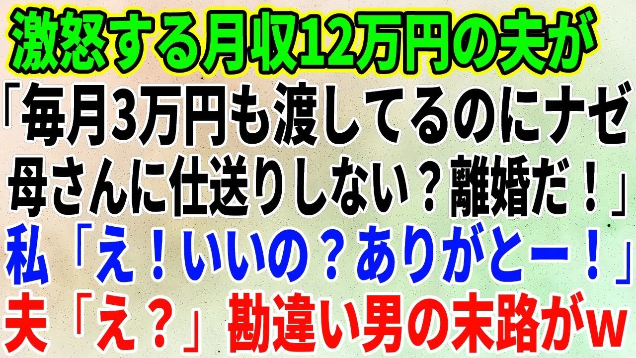 【スカッとする話】激怒する月収12万円の夫が「毎月3万円も渡してるのにナゼ母さんに仕送りしない?離婚だ!」私「え!いいの?ありがとー!」夫「え?」勘違い男の末路がw【修羅場】