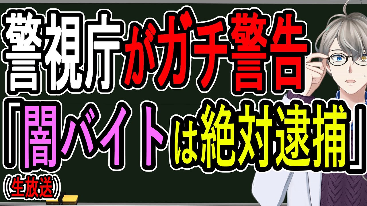 [音楽] [音楽] [音楽] [音楽] はいどうも皆さんおはこんばんにちは犯罪 が教室のカエ先生ですいかがお過ごし でしょう かかかいうところでえ皆さんゴールデン ウィークお疲れ様でした本日え務所からえ 仮釈放されてですね無事えシバに戻ってき たえ犯罪が教室の金井先生でございます もうずっとねここ数日もう1日2回放送 できずま夜しか放送せずですね皆さん たくさんご迷惑けしましたもうね事件がね 列をなしてまってるような状態で1つ1つ ねあの解説していこうと思ったんですがま あそれにしても今回ちょっと面白い ニュースがあったんでこちらちょっと 取り上げていこうかなという風に思います あおめあますねなんか僕も貸になれるのか なと思ってねち先生のねあのぺらって見て あの本見たらですね僕脅されてましたね組 調査にね僕涙止まらなくなってましたけど ねはいあの最初僕そんな説明あ軽くは受け てたんですけどねあの情けない キャラクターの設定になってましたんで 是非あの懲役の時期の極道パラダイスの方 も買っていただければなっていう風に思い ますはいよ長お勤めでした今回はねしかも 多忙極まりないところでねあの全く休め なかったんですけどもえっとそんな中で ですねついにえ警視庁がガチで警告を始め ましたはいこちらですえ闇バイトあの絶対 捕まえます概要欄に貼ってあるんでもし よかったらリツイートとかして拡散して あげて欲しいんですけどあんま目立って ないので えっとなんとです ねえま警視庁ですあの警察庁じゃなく警視 庁の生活安全部っていうところがまあるん ですけどまそこがですねあのもう必ず 捕まえるであのSNSの工学報酬に気を つけろってこなんですけども半分切れてて 半分ちょマジで本当にやめてっていううん それマジであのシャレにならんやつやから やめてっていう風に言い始めたっていう とこでまそれだけやっぱこの事件のね闇の 深さみたいなところが見えてくるんじゃ ないかなで今ねの事件もその闇バイト云々 で言われてますけどま僕とリーゼントでか はまずっと言ってる通りまこれ闇バイトっ ていうよりかはまちょっと複雑闇バイトの 仕組みを使った複雑な犯罪が行われたんで はないかと思うんですけどえ皆さんに ちょっとねえお伝えしなければならない ことが言っ点んだけありますチラチラ見え てて怖いなって思ってる人いると思うん ですけどなんと最近闇バイトを消す闇 バイトもえ僕の中で確認できましたあの 安易に闇バイトに参加したりとかま ちょっと足がつきそうだなて今まではね とかのしっぽ切りで話してくれるわけです ぱられて終わりだったのが闇バイトをま その情報持ってる人を 消すはいでじゃどうやってやるんですすか て話もねこれちょっと実力っていう形で ちょっとお話ししていこうかなという風に 思いますこれねなかなか興味深いので すごい面白いな末端同士で孤独みたいな 感じじゃないですけど食せみたいなことが 一部で確認できましたで今これはね大分け に広がってるわけではないんですけども 確認できたんで今一応それもちょっと話し ていこうかなという風に思いますはい ちょっとびっくりしましたねでえ サムネイルも開けて今回の内容はこちら ですえ質疑応答はですねえ最後にまとめて え受け付けますとためになったなと思って いただければチャンネル登録と高評価の方 よろしくお願いいたしますでえ警長がね 緊急生命ですえ闇バイト絶対捕まえるマと かしてますあの警視庁としてはあまりにも 闇バイトが多すぎるというとこでふざけん なっていうことでやめましょうで実は報道 されてないだけでまかなり闇バイト関連が 多くなってますよっていうことが明らかに なってますでもちろん捕まるんです捕まる からこそ闇バイト関連ってことが分かる わけなんですけど捕まえたら闇バイトでし たってのがかなり割合として多くなって るっていうとこでちょっとびっっくりして ますよとでついに大手求人サイトにも闇 バイトが掲載されるようになりました びっくりです ね すごいあのこれ衝撃だと思うんですけど 例えばあの運びの仕事をなんてやるかって 言うと運送 と笑っちゃだめですけど運送とはいあとは えっと例えば他にもなんかジモティとかに もね乗ってたりあとは死体処理に葬儀場の スタッフとかはいあとは軽作業ね何の軽 作業をするか分かりませんけどもねあとは まなんかそのイベントスタッフみたいなん で言ったらあれっていうねまあのなかなか に闇が深いような状態ではあるんですけど もちょっと皆さんねあの気をつけて いただければなとまこれからアルバイト 始める大学生とか高校生も多いと思います んでね今Z世代の40%ぐらいそういうの でアルバイト探してるっちゅう話もあり ますから是非皆さんもちょっと今回気を つけていただければなと思いますそしてね あの栃木のナスの遺体事件意も実は ちょっとこの闇バイトの関係のところで 関係してるところがあるんじゃ