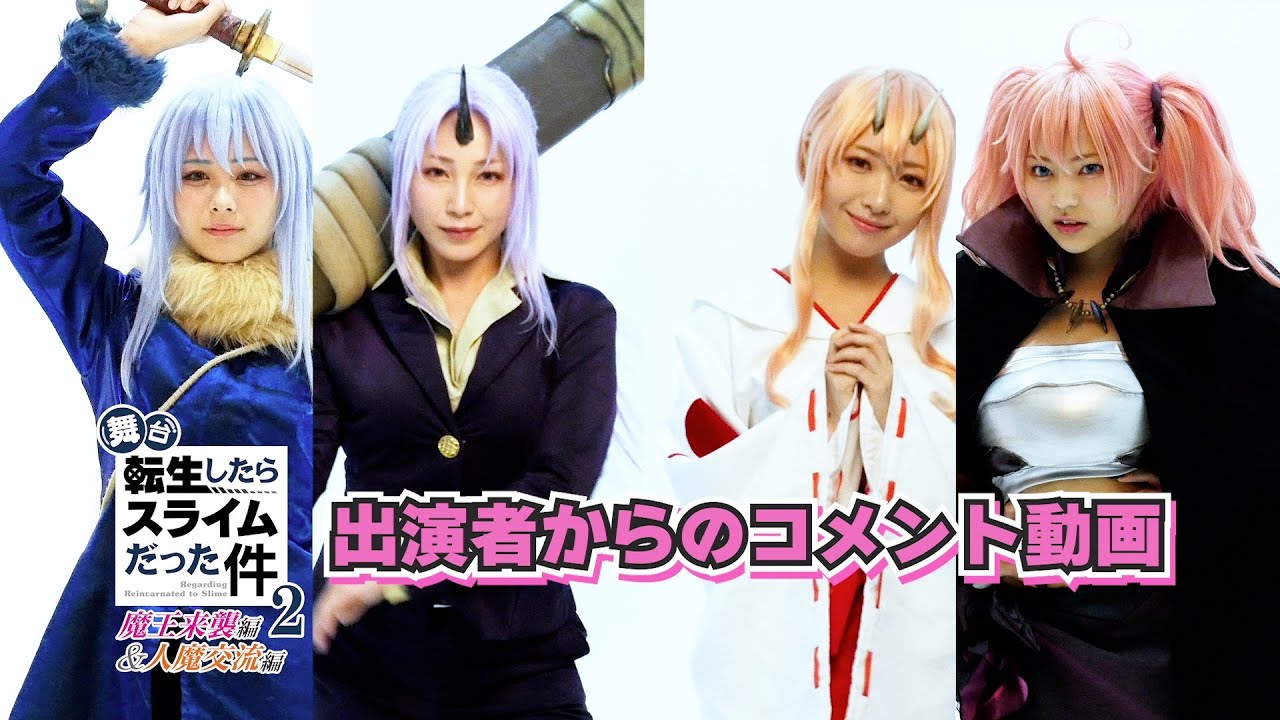 [音楽] 皆様こんにちは舞台転生したらスライム だったけ魔王来週編&ジマ交流編にて出演 させていただきますリムルテンペスト役 ノトコミの小花ですはい第1弾に続きまし て第2弾でも主人公リムルテンペスト役を 務めさせていただけること本当に公演に 思います第1弾本当に本当に楽しくて素敵 な夏の思い出になったので今回も皆さんと 一緒にえ夏の思い出を作れたらなと思って おりますえ私はすごい原作の点スが大好き なんですけど大好きなポイントの1つとし て仲間がどんどんどんどん増えていって街 が賑やかになるところが大好きなので今回 たくさんのメンバーが増えるということで 私自身もどんな講演になるのかなと ワクワクしておりますえ皆さのご来場大変 お待ちしております皆さん是非来て ください舞台転したらスライムだ県魔王 来週編&陣馬交流編に出演させていただき ますシオ役の菊川ゆです今回も前回に 引き続きえシを演じさせていただきまして 本当に嬉しく思っておりますありがとう ございます今回はキャストさんがまた さらにあの若い方たちがねたくさん増えて またさらに舞台が盛り上がること間違い なしですので是非東京大阪2024年の夏 遊びにに来ていただけたらなと思います キャスト1度首揃えてお待ちしており [音楽] ます舞台転生したらスライムだった件魔王 来週編&ジマ交流編に出演いたしますし役 の石田千穂ですはいえこのような素敵な 作品に出演することができてとっても 嬉しいです今日は初めてシナになったん ですけれどもこのピンクの髪だったり瞳も あとは角もえ普段の私と全然違うので新鮮 ですえ本番までたくさん勉強して素敵な 作品をお届けできるように頑張ります是非 お待ちして ます舞台転生したらスライムだったけ魔王 来週編ジマ交流編のミリムナバ役を務め させていただきますババババンビの桃色 なとうですはいこう第1弾が終えて第2弾 にこうして出演させていただけることを すごす嬉しく思っています私にとって 初めての今回が演技お芝居なので精一杯 頑張りたいと思います私自身もすごいミリ も大好きなキャラクターなので今回こうし て決まってすごく嬉しいです皆様と当日お 会いできるの楽しみにしています [音楽]