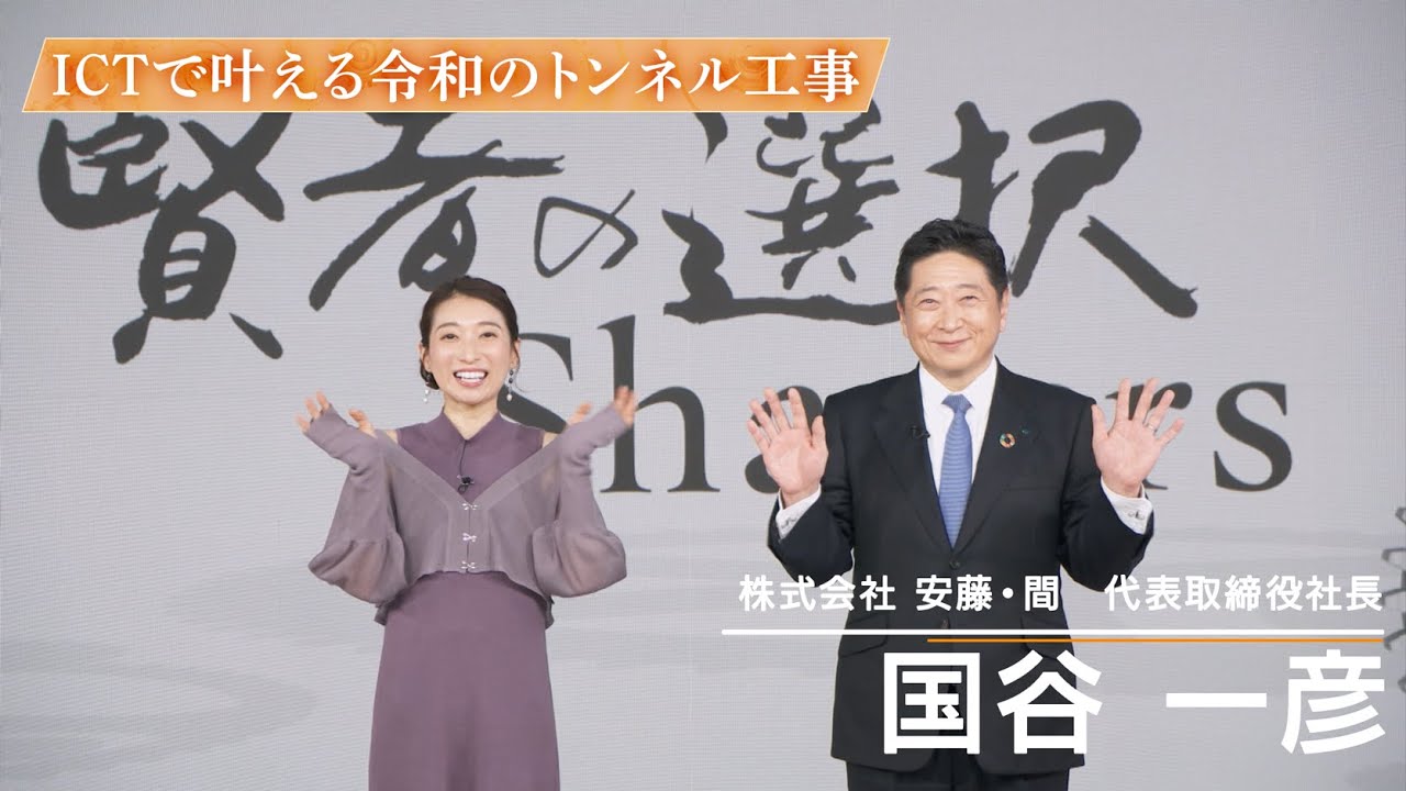 時を刻み時代を作る賢者の選択 [音楽] シパーズ賢者の選択シパーズナビゲーター の蟹瀬誠一です山田もこですえまこの番組 もね2004年スタートして20年近く 今回新しくリニューアルをしまして賢者の 選択シパーズとこれからいろんなところで リーダーになってく方々そして今リーダー でいらっしゃる方々がね新しい価値を想像 していく時にどういうことを考えてるのか またどうやってその価値を想像するのか とえこの辺りを中心にいろんなお話を伺っ てまいりたいと思います事業の強みや社会 的使命そして今後のビジョンと世の中に 伝えたい情報と知られたる魅力を分かり やすく視聴者の皆様にお届けしていきます 今回の時代を作るシパーズはこちらです 株式会社安藤狭2013年建築に強みを 持つ安藤建設と土木に定評のある狭組が 合併して誕生した安藤狭は土木建築事業を 中心にカーボンニュートラルなどの環境 対策DX推進に向けた先端技術の開発にも 取り組んで いるそんな安藤が今最も力を入れている 分野の1つがバルクの強化です生産性 プロセスを改善することで生産性向上と 現場の環境改善に取り組んでいます今後も 現場力を強化して人と技術で未来に挑んで いきたいと考えてい ます本日のゲスト株式会社安藤狭代表取締 役社長邦彦さんですよろしくお願いいたし ますよろしくお願いしますどうもよろしく お願いしますよろしくお願いし ますさて番組では未来をリードする アイデアや取り組みを未来の種と称してお 話を伺っていきますえ安藤狭の未来の種と は何でしょうかはい山岳トンネル統合型 掘削管理システム通称アナムです非常に やはり技術力の高いえこう機材が使われて るって感じはしますよねはいうんさてえ この未来の種がどのような新しい価値想像 の言動力となるのか探ってまいりましょう さて先ほど未来の種としてご紹介いただき ました山岳トンネル統合型策管理システム とはどのようなシステムなんでしょうか このアナムはトンネル施工におきまして 自動化や無人化といった行動化技術それと ICT技術を利用して工程や品質から地質 情報などを取得分析する技術それを合わせ て施工情報を集中管理することによって トンネル全体の工事の生産性と安全性を 比較的に向上させるシステムですまあ私 なんかはねトンネルっていうと職人さんが こう掘り出していくっていうイメージが すごくあるんですがいわゆる工程としては 同じことをやってるってことです昔から 葉っぱと言われるダイナマイトの爆薬を 使って掘削をするというところは変わりは ないんですけどもそこにですね情報技術 ICT技術を活用して情報を集中管理する ということが違ってましてまそれによっ てん非常に少ない人数で安全に無駄のない 作業ができるようになって ますこちらは北海道新幹線のトンネル工事 が行われている知トンネル天神 航空この現場では安藤狭が開発してきた 山岳トンネルの施工を行動化する要素技術 が数多く取り入れられているこちらでは どういった工事が行われているんですか はいあの北海道新線の時の1つとなって おりましてあの爆薬を用いて掘削を進める 山岳トンネルの現場となっております山岳 トンネル候補は一般的に葉っぱまたは機械 人力により掘削を行う掘削で出た釣りと 呼ばれる土砂の搬出を小さな岩などの落下 を防ぐためコンクリートを吹きつけて 固めるさらにガ板が崩れないように トンネルの形状に合わせて確保した骨組 高成子方向を設置 その後コンクリートの2次吹き付けを行い 最後にロックボルトと呼ばれる攻防を放射 場に設置するこの一連の作業を繰り返し ながらトンネルを掘り進めていくという1 回でどれぐらい掘ることができるんですか 山が硬くていい状態の時は自に2mですと か索する時もありますしあの山が 柔らかかったりですとかあと水があったり ですとか山の状態が悪い時は1mずつあの 速したりとその山の状況を見ており ますこれは葉っぱの際に爆薬を仕込む穴を 開ける全自動ドリル ジャンボ従来ですとえ穴を開ける作業は3 名で行っていたんですけれども現時動ジボ を入れることによって3人から1人に 暮らして先行作業を行うことが可能となっ ておりますどうして人数を削減することが できるんですかパパターン作成プログラム という当社独自のプログラムを使いまして 健光位置を自動でししましてジャンバにえ 読み込ませることによって2人がボタ1つ 押すことで自動で先行する作業が可能と なっており ます10秒後に葉っぱがなりますので耳を ういでくださいえはい10秒 前 はい [音楽] えびっくりしたあ怖かっ た予想以上でし たこちらの現場では掘した土砂を運ぶため にベルトコンベアが設置されている以前は どのように土砂を搬出していたんですか 大型のダンクトラックを2台から3台使用 しましてトンネルの校内を往復することに よってあの切り作業を行っていりました そうしますとトンネルの中で働いている他 の機能者さんとの