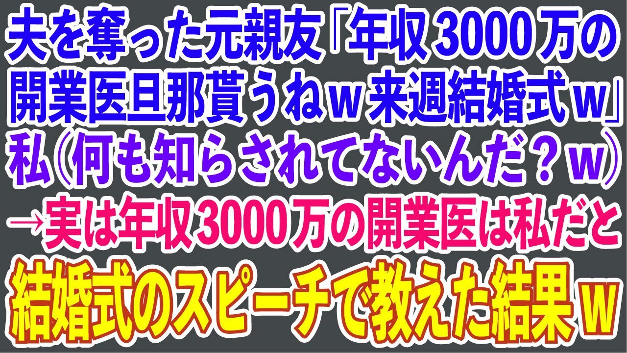 【スカッとする話】夫を奪った元親友「年収3000万の開業医旦那貰うねw来週結婚式w」私(何も知らされてないんだ?w)→実は年収3000万の開業医は私だと結婚式のスピーチで教えた結果w【修羅場】