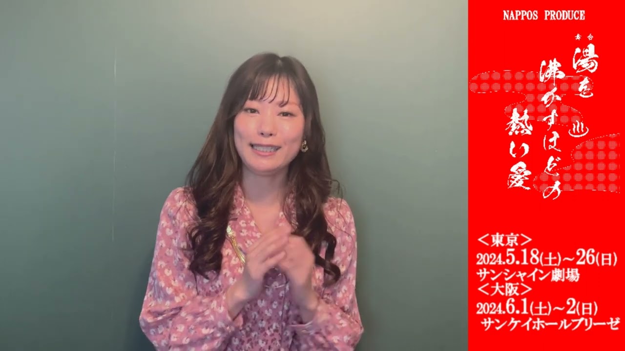 えと向田あとみの同級生あと医者役をやら せていただきます和田南ですはい今回私は 3役やらせていただくんですけどそうです ね下が16歳上が64歳までとかなり 幅広くなってるんですけどそれぞれの役で ちょっと皆様にいいパスを渡せれたらなっ て役としていいパスを渡せれたらなって 思ってますはいで私が初めてこの作品を見 た時にま感動したのはろだったんですけど すごく明日からも頑張ろうとか勇気を もらえたんですねなんか自分まだまだ できるんじゃないかなって思えたので皆様 にも今回この舞台を見ていただいて勇気を 明日からも頑張るぞって思って帰って いただければなって思いますはいでナス プロデュースべた世沸かすほどの熱い愛 是非劇場でお待ちしてます