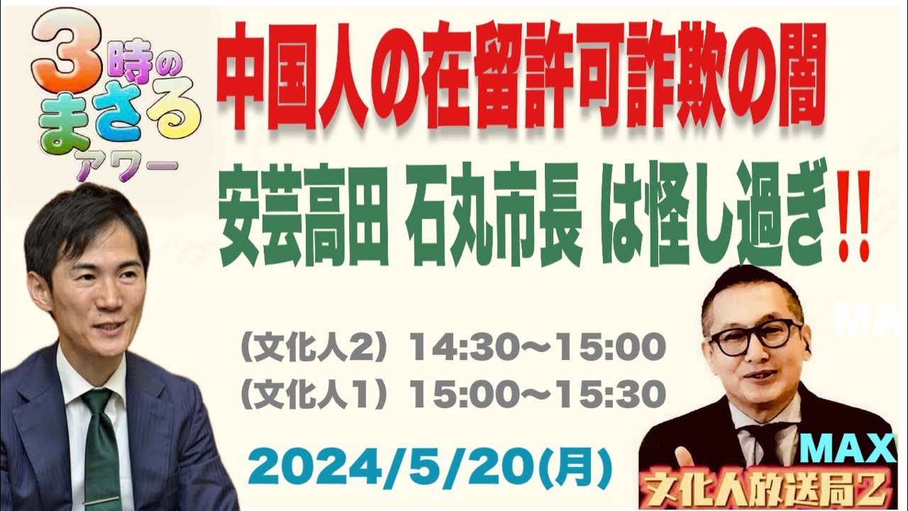 【中国人の在留許可詐欺の闇】安芸高田 石丸市長が怪し過ぎる…他 2024/5/20(月)文化人② 14:30~15:00『3時のまさるMAX』