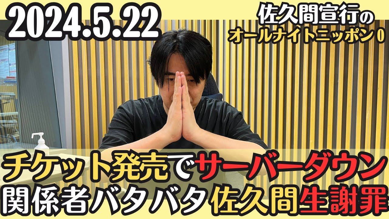 こんばんはテレビプロデューサーの佐の です乃木坂46の久保さんお疲れ様でした 2024年5月22日水曜日この時間私佐 延が日本放送からお送りしてまいります えっとですねあのすいませんあの皆さんに ちょっと一応あのお話したいことがあり ましてあのちょっと聞いていただきたいと 思いますあのえ本当にやろうとしてた テンションでまず1回話しますね番組冒頭 からいきなりのお知らせです年の番組 イベント延のオールナイト日本0リスナー 長感謝祭2024新事体チケット最速先行 販売が27時の番組開始と共にスタートし ましたっていうつもりだったんですけど あのそうすねあの今この10分間の間に僕 の間に起きたことを説明します え50分ぐらいからえブースの外にスーツ 姿の大人たちがたくさん あの笑笑と集まり始めえ相談をし始めで なんか俺は遠巻きになんかあったのかなっ ていうのだけちょっと見ていてえモそし たらブースにモニ服したようなえっと人 たちえ簡単に言うと日本放送の プロデューサー日本放送のイベント部の人 たちえそしてですねえEプスの皆さんが いらっしゃってえっとですねあの僕の今ね 今整理してる最なんで説明するとえサーバ が完全に落ちている状態でえサーバが完全 に落ちている状態になってしまったので え繋がらないとで繋がらないのででこれが 運営中に復旧しそうだったらえ初めて 繋がったところからなんだけどえオエ中に 復旧する目処が立たないどうやどうやらな のでえ今日の販売が中になるらしい中止に なるでいいのかなだよですよねほぼ中止に なるということであの改めてスタッフと いうかあのえスーツ姿の人たちも全部え 代表してえまず本当に申し訳ありません あのですねあのだって今日のために休みを 明日撮ってくださった方とかえ いらっしゃるじゃないですかでなのでその 方々がないということもまあるしあとこれ 後日発表というのがあのどうなるのかあの チケット自体がどういう発表発音になるの かっていうのは今え外にたくさんいるなん つったらいいんだろもう俺からは服姿の人 にしか見え ないおっさんと大人たちがなんですよそう いう状態になりましてあの明日早い人なん で今日急に夜中から売り始めるってことも しないんで しないんですよしないんであの寝て くださいはい本当に申し訳ないいすあのあ ちょっとその今日急にあの売るとかはし ないんで本当に申し訳ない寝てくださいで あのとはいえあのゲスト発表とかはします あのなんでかて言とそれはもう発表する もろもろが段取りももろもろありますんで はいなんでえこれがしても寝てくださいえ で簡単に言うとリスナーの皆さんが集まり すぎたというかまそれもありますそれも あるがまそうね日本放送とeプラスがあの ちょ番組を舐めてたという か本当に申し訳ないあそのリスナーのこの なんか熱というかバリューというかあの その辺がえ なめてたっていうことになってるってこと なんですよこれ今ちょっと俺も分かんない んだけど今サーバーにはもう落ちてるん です入れないって入ってるもしくはそれと もなんかなってるんですか え今ちょっとそこをですねあの今確認して ます あのあのただ今俺があのどの部署の人に 話しかけても全員あの腰を90度に曲げて 話すんで誰とも目が合わない状態になっ てるんですけど 簡単に言うと本当に あのなんか変えてる人見かけたっていうの もあるけどそんなことはないんですよね うんそれは多分ないはずち確認してます 多分変えてる人なんていないはずだと思う んだよな閉じるってさっきおっしゃってた んであのだから先着にするからだよって いうのはみんな思ってるでしょあのみんな 思ってるよねみんな思ってる先着に するからだよっていうのもあるけどうん なんかXで報告が上がってるっての来てる よこれ本当ちょっと待ってこれはルポだぞ ちょっと待そんなことある買えないって 買えないようになってるって今俺は説明 受けたぞ買えるなんてことあるかえ寝て いいって言っちゃったぞ俺寝ていいって 言っちゃったからな帰るのはやめてくれ よ間もなくで変えないはずになってるはず だよこれちょっとこのXで変えた取れたん だけどこれどうなるんだって人がいるよ ほらえちょっと待ってこれ 本当取れた人がXに現れたよちょっと待っ てちょっと待って くれ今ちょっとあの日本放送とあのe プラスがほとバタバタしてるんであのどう する普通に関係ないフリートから するあ閉じる前に変えたりしてんのかな あのでも基本的にはさっきまもう1回説明 するとま10分前ぐらいに えみんな入ってきてでなんか俺がトイレま ルーティンで言うと俺は大体そのジングル を取ったらトイレに行ってでうがいとかし てで戻ってくんの戻ってきたらさっきまで 楽しくジングルを取ってたはずのブースに スーツ姿の大人が8人ぐらいいて全員下を 向いてる状態で俺どうしたんですかいや どうしねえななんかあったなって思ったん ですよなんかあったな