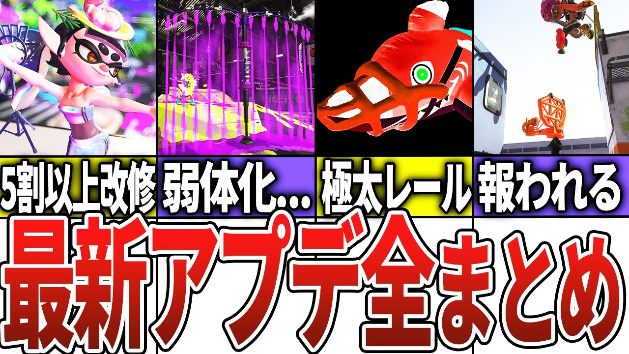皆さんこんにちはゆっっくり魔理沙だぜ ゆっくり霊夢です2024年夏しる シーズンの開幕である6月1日が迫ってき たわねああそこで今回は現段階までに判明 してる新シーズンの紙要素を全てまとめて お伝えするぜワクワクそうそうこの動画は スプラ3ヒーローモードとダウンロード コンテンツの内容についても触れているの でネタバレが気になる人は注意してくれよ なよろしくお願いしますそれでは早速紹介 していくぞゆっくりしていってね ゆ1個目メインサブスペシャルの調整アン 修正次シーズン開始に合わせて既存の メインサブスペシャルに調整が入ったわね ああメインが強化されたのはNザッL3 リールガンラピッドブラスタートライ ストリンガーラト450だなドサ草に紛れ てNザップが入ってる個人的にラピッド ブラスターもびっくりしたなサブは スプラッシュシールドが相対的に化された わねああ多くの単射艇からシールドへの 攻撃力が上がったなスペシャルが強化され たのはサメライドグレートバリア旧インキ 墨流しとねサメライドのレールに沿って インクが塗られるようになった修正は かなり色々なことに使えそうここがち漁り 持ちのための道作りとかできそうだよな スペシャルポイントの変更もあったわね ああ強化されたのはワイドローラーコラボ とフィンセント弱体化されたのはリッター 4系カスタムスコープだなリッター&帝王 の組み合わせだものねあとは連射込んで ボトルガイザーを使いづらくする調整が 入ったな武器の本来の連射感覚よりも短い 感覚でZRボタンを連打し続けている時次 の弾が発射されるまでの感覚が長くなる ようにしましたってそういう意味だったの ねそれからスパイガジェットの傘復活バグ が修正されたみたいだなスペシャルのサメ ライドが強化されたしスパが使いのいこ ちゃん大歓ねあと武器性能のとはちょっと ずれるけどビーコンを味方が使用した回数 が表彰されるようになったなビーコン設置 してくれる人が報われるようになって よかったビーコン職人さんいつもありがと な2個目ステージ回収ア変更回収される ステージは2つ正葉海峡大橋とタラポート ショッピングパークねこの2つのステージ は回収に合わせてつまり5月30日木曜日 午前9時から31日金曜日午前11時まで の間バトルステージに選ばれなくなるぜ ステージ回収のお知らせっていつもいか 世界の雰囲気を壊さないようになってて 個人的に好きだわ個人的にって言うなら タラポートは押し込まれるとどうしようも ないステージでマは単射程を持つと辛い ステージって印象があるからこの2 ステージが回収されるのは嬉しいぜてか タラポートってさ確かビッグビッグランで 鮭に襲われるって言ってなかったっけ つまり収から週間で鮭に壊されるのが確定 してるわけかクラゲ君修理頑張ってこの2 ステージほど代々的な回収ではないものの 次シーズンでは多くのステージで変更が あるみたいだぜ全ルールで地形変更する ステージもあるのよねああ全ルールで ステージ変更があるのは金台美術館 ナンプラー遺跡草や温泉湯の花大警告金台 のガチエリアガチホは中央の回る壁の形状 も変更されるぞ全ルールで少しステージ 変更されるのはやが1場ヒメが丘地下空港 マンタマリア号ねこの他高橋経済トックで は縄張りとガチエリアでネギトロ単行では ガチ漁りで地形変更があるぞアプデ5の 散歩が楽しみだ わ3個目新武器今回実装された新武器は2 種類だぜフルイド5とデンタルワイパー ミントねそれぞれの武器セットはフルイド 5がロボットボムとウルトラハコデンタル ワイパーミントは9ボムとグレートバリア だぜフルイドはそのままフルイドが モチーフみたいねトラスト勢を待ちかのシ ストリンガーだコミュニティでもフルイド 5楽しみだなかこトラストぜってコメント があったぜ5本のインクの同時発射って とこでクマさんストリンガーを思い出した わ改めてマストの9本発射って化け物だよ な一定以上チャージすると発射される インクの向きが広がっていくのも特徴的よ ね霊登とロボットボムの相性も良さそうだ し心地が気になるぜデンタルワイパーは 旅行とかに持っていく歯磨きセットが モチーフよねスパッタリーとは親戚になる のかしら確かに歯つながりだよなデンタル ワイパーは何と言っても抜頭のかっこよさ に目がいくよなコミュニティでもデンタル ワイパー抜刀なのかっこよすぎだろいいで 日本なしさがあるねっていう喜びの声が あったぜやっぱり抜刀術はロマンよね 横切りの塗りがかなり強くて塗り力は おそらくワイパー種最強 後半1角ダメージアため切りプラス横切り のコンボもありってことでネットでは かなり強いんじゃないかって予想してる人 が多いイメージだな強かったらもちろん ロマン武器だったとしてもモーションの かっこよさでマ武器にする人とかもいそう よねそしてそしてこの武器たちまさかの マイナーチェンジが同時実装なんだよな フルイド5カスタムとデンタル