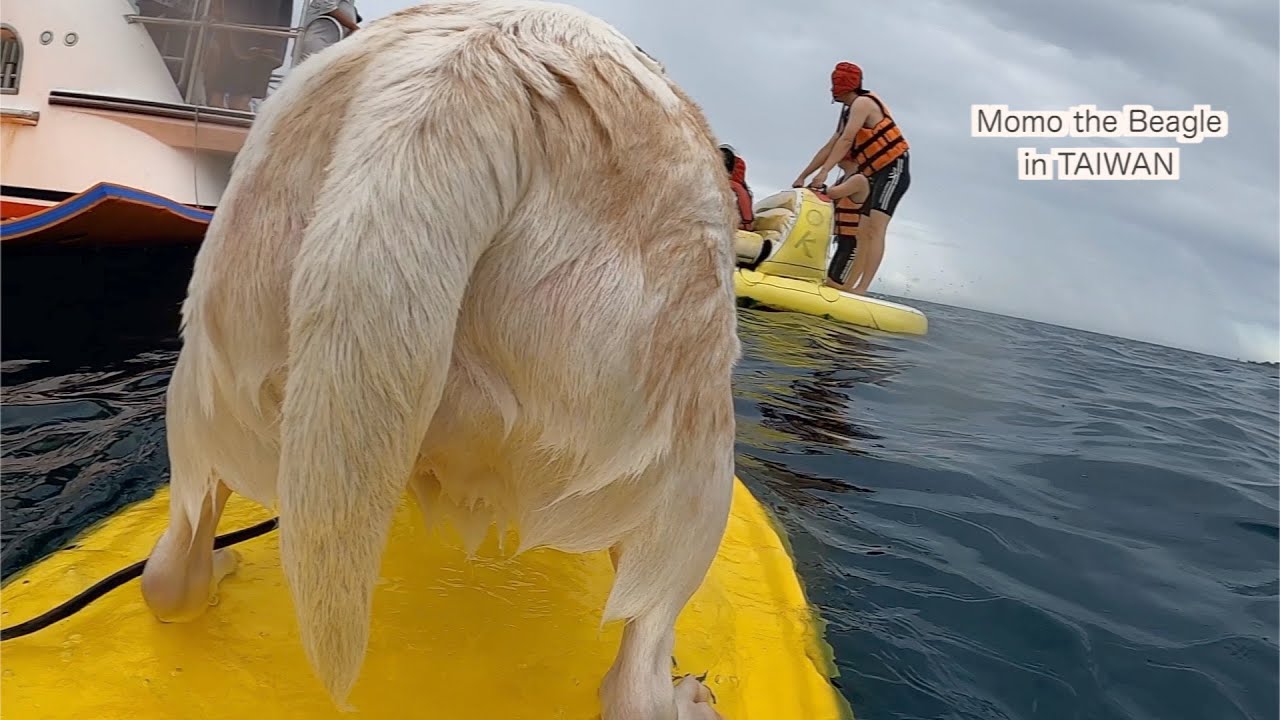 ビーグル犬モモ、天気が悪くてもマリンアクティビティを満喫する