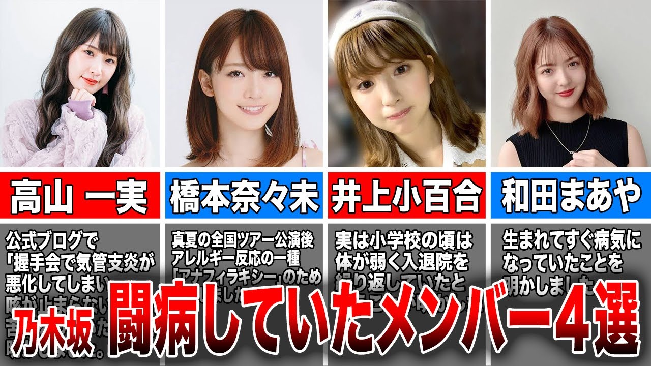 アイドル界のトップを走り続ける坂道 グループ彼女たちは日々健康に気をつけて 生活をして病気や怪我をしないように 心がけています乃木坂でも生活や体のケア に気をつけていますが病気になってしまい 給養を取ったり病気と付き合いながらも 活躍しているメンバーもいますでは今回は 投票していた乃木坂メンバー4選を紹介し ていき ますまた坂道グループが好きな方は是非 チャンネル登録をよろしくお願いし まずは高山かさん です公式ブログで握手会の途中で期間支援 が悪化してしまい実は1ヶ月前から治って おらず収録の時はギリギリまで雨を舐めて ないと席が止まらない状況だったと苦労を していたことを明かしました公式ブログで いつも応援ありがとうございます先日の 握手会では途中で機関支援が悪化して しまいすみませんでした実は1ヶ月前から 治っておらず収録の時はギリギリまで雨を 舐めてないと咳が止まらない状態でした すごく忙しい期間に発症してしまい なかなかゆっくりと給養が取れなかった ため席が感知できなかったみたいです仕事 をいただけるのがありがたくて周囲にも なかなか言えず結果症状を長引かせて しまいました大好きな歌がずっと歌えなく て本当に辛かったですこのまま歌えなかっ たらとか考えて泣いた日もありました皆 さんを心配させして本当にすみません体は 元気なのですよ咳だけねあ昔から間が弱く て困るアイドルなのに情けなです本当に すみません明日母と病院に行ってきます 直すぞ大切なファンの皆さんへ感知する ように応援してくれると嬉しいですと話し ていましたその後卒業を決めた時には卒業 を決めたのは結構前乃木坂バースデー ライブを2月に毎年行ってるんですよ 22日がデビューシングルの発売日だから で毎年ライブしてるんですけどなーちゃん 卒業して次の年のバースデーライブかな その時に私はなーちゃんのソロ曲を歌わせ てもらったのね何曲かすごいすごい好きな 曲だから頑張って歌いたかったんだけど2 月22日ってね毎年私ね全速がひどくなっ ちゃうの冬場すごいあの機関誌が弱くなっ ちゃうんでだからその時も歌えなくて思っ たように咳が辛くてだから来年からはもう 無理かなって体力的に無理かなみたいなの をうす感じで次の年だからそのバースデー ライブは次の年出れないけどそれの前後 ぐらいでやめるかなみたいなのをうっすら 考えててでもコロナになってまあまさかの 事態だし全然やりたかったイベントファン の方と会えなくなっちゃったりとか色々 あってあれもちょっとやりたいと思うよう になったりとかしてあはバースデーライブ も配信になったから体力的にはすごい楽で 私は今年なら大丈夫だとか思ったりとかし てて自分の中では10年っていうのが なんか10年に固執してた部分があった からだからま当初の寝予定というかこれ くらいかなという時期も約10年ぐらいで やめようかなと思ってたんだけどまあ10 年も過ぎるしあとはまあいずれやめなきゃ いけないんだったらこのタイミングかなっ ていうのがここだったので卒業を決めまし たと苦労していたことを明かしまし たアイドルにとって大事な喉はしんどい 状況でもファンのために頑張っていた高山 さんは本当にすごいなと思いますこれから も自分の好きなものを頑張っている高山 さんを応援したいです ね次は橋本七美さん です乃木坂真夏の全国ツアー2014の 大阪公演後アレルギー反応の一種である アナフィラキシーのため入院しまし た橋本七海さんは乃木坂真夏の全国ツアー 2014の大阪公演後ある病気のため入院 しましたその病気とはアレルギー反応の 一種であるアナフィラキシーです結局病気 のため福岡宮城仙台名古屋公園も欠席する ことになりました自身のブログで待ってい てくれた方楽しみにしてくれていた方出演 できずごめんなさい途ち者今は正直どうし たらいいか分かりません早くライブに出 たいです色々検査もしてるし治療もして ます神宮に立ちたいという気持ちがあり ますと綴り今月30日のツアファイナル 東京明治神宮球場公園での復帰を目指して いると悔しい思いを話していましたその後 公式ブログで今回診断された病気 アナフィラキシーの原因はまだ分かって おらず退院してもまた再発しては入院を 繰り返していますと現状を綴っています 病気の原因が分かっていないんです原因 さえ分かれば治療の使用があるので光が 見えてくると思うのですが原因不明だと 対処のしょうがないです2013年7月 放送の乃木坂ってどこをシズシングル ガールズルールヒット祈願バンジー ジャンプの回で橋本七海さんは1人だけ ジャージ上下を着てきてその理由として 虫刺されアレルギーーなんですよと述べて います虫刺されアレルギーーも アナフィラキシーの原因になり得ると思い ますが不確かなものですアナフィラキシー はアレルギ症状が人魔シなどの皮膚症状に とまらず呼吸機や消化器など複数の臓器が 一斉に反応して劇的な症状が現