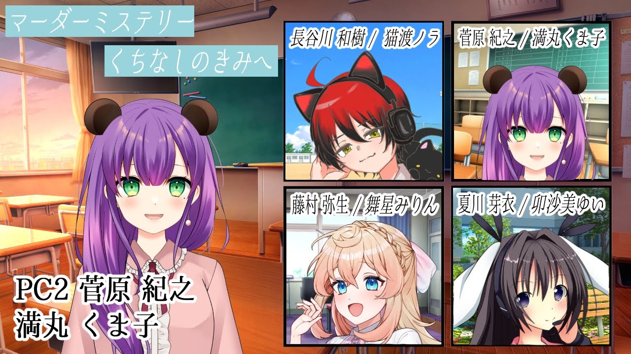 [音楽] NDET [音楽] [音楽] H [音楽] りましたでしょうかはいはい はい皆さん大丈夫 はい皆さんこんばんは今夜はねこちら マーダーミステリーの口なしの決めをやっ ていこうと思っておりますんでよろしくお 願いしますお願いしますお願いしますはい まず最初ねえいつもなんだろうマーダー ミステリーとから始まってるかなうーん いや自己紹介からかな自己 紹介じゃあねえ最初ね自己紹介まPC1 からね今回GMがねえなしGMレスねやっ ていこうと思っておりますでか所4名がね それぞれえプレイヤーごとに分れて演じて いくことになっておりますでねPC1の私 からね軽く自己紹介やっていきますねはい 今回ね長川かず役をやっていきます猫 あたり野良ですね え考えてなかった なまあねえこうまミスしたいなとね色々と こう探していく中でねこちらを見つけた わけなんですがねまその概要欄とか見て たらさあこれめちゃくちゃエモそうだぞと ね思ってねえ皆さんを呼んでね一緒にやら せていただくことになりました非常に 楽しみです本日はよろしくお願いしますお 願いしますお願いします拍手ナイス センキュー センキューはい次じゃあくこさんですね はいえっとくまのぬいぐるみピアノ vtuberのまんまるくこです今日は えっと 菅原のりゆのゆさんちょっと名前の読み方 知らなかったのゆさんをやりますえっと まだねハンドアウトを見てないからどんな キャラかわからないけどなんかうちきそう なね感じでねすごいあの楽しみくまね えっとあのGMレスのシナリオやるの すごい久しぶりなのでちょっとあのくま子 の方がねあのくだっちゃったらごめんくま だけど楽しんでやっていきたいと思うので よろしくお願いしますくまお願いしお願い し ますお次じゃあみりんちゃんお願いします はい絶叫系vtuberのハロみりんです ただいまインプラントの手術をしまして歯 にネジが入っておりとこを何針も塗って おりいいという口調すると歯茎がちぎれ そうで怖いのであまり笑えない状態なん ですが頑張って頑張っていきたいと思い ます今日は村やよいちゃん役で頑張ります のでよろしくお願いしますお願いしますお 願いしますはいじゃあじゃあ大と大と 大トロ大大トロいやさっきからねあのなん だっけディスコのボイスチャンネルの えっと名前の名前と苗字の間に半額入っ てるの入ってなかったね記念になって ます本当だ本当だすごいそこに 気うです えっと普段マナビスしたりマナビスを作っ たりしています今日はえっとメイちゃん役 をやっていきますえっとね今日はねメイク 門をまパートナーに遊んでいきますメメイ ポケモンデジモンですねデジモンかメイ ちゃんって言ったらもうトトロのあれしか 思キデジモントライですねトライわから ない 新しめいや映画で6勝やったやつですへえ え6章そうの6章映画でやったやつあ6章 ねえてこと ですた高校生の大たですねそうなんだ見て ないあの初代のアドベンチャーが10年後 そんなどもいいです気になっちゃった ちょっと気になっちゃったねみみちゃん 好きだったから私あみちゃんもねえ帰って くるんでねほと見た方がいい私の声も帰っ てきたわ今どっか から んで今はんね2年生の美術部らしいです はいまだハンドアウト内容は見てません 今日もよろしくお願いします見ていない はいお願いしますお願いしますはいではね 今からあのおりを読んでいく前にマーダー ミステリーとはについてね話していこうと 思っておりますよっしゃケボ行き [音楽] ますあああマーダーミステリーとは プレイヤー1人1人が自分に割り当てられ た設定書に従ってミステリー小説の登場 人物になりきり犯人を推理したり自分の 秘密の目的を達成したりするゲームです 詳しくはGoogle先生に聞いてみて ねまたマーダーミステリーは1度シナリオ を知ってしまうと自分でプレイすることが できなくなります今後プレイする予定が ある方は視聴をお控えしてくださいます ようお願い申し上げますマーダー ミステリーは内容を知ってしまうとその シナリオんこれ書いてない書いてあるだ ちゃ えちょっと歯茎がちぎれちゃうから笑わさ ないでくださいかぶってんじゃんこれ私 ずっとこれを概要欄に書いてるの にえ最後ねゲームの性質上ゲーム中は コメントを確認することができませんので よろしくお願いし ますわかしてくれたな てくちゃうよそれではねえ早速ストーリー の方ね見ていきましょう盤面のね1番左下 のこのストーリーと え すすすえっとシナリオスペックかな おお定屈えね左さねストーリーとシナリオ スペックを皆さん見てくださいはいこれ しなれえそうだ野良さんとなんだっけな 魔女魔女かなんかの時もケナリよってなん だろうね言った記憶が今思い起こされた わ英語弱きでごめん なさい面白はいりですねえ長いよで短かっ た夏休みが終わり資業式の日新学期の始め に衝撃衝撃的なニュースが生徒たちを襲う 2年2期目の杉のあさんが亡くなりました 夏休み最後の日彼女はどうして死