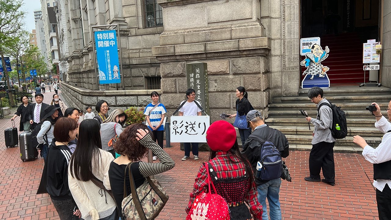 ええめっちゃ怖いんだ けどJA あ やこれで こんにちはま太陽に向かってこう自分の影 を10秒ぐらいまきしないで見てそれを空 にると目の残像現象でその自分の影が 大きく空に浮かぶていうのま 影なってそれをまちょっと使うのでま ちょっと練習がてらそうですね最はいじ ないで今日その太陽が出てないですしその 元々の影できないんですけど僕たちが やろうとしてるのはそそれではなくて えっとここに影を影としてえ頭を描きます で練習ちょっとやってみようと思い ますライブペインティング はいおい ぽぽでこれをそうえ影に見立ててこ影送り しようと思いますさっきも説明したんです けどえこれを目をあのまきせずにまあ大体 10秒から15秒ぐらいこの真ん中ありを ずっと凝視してくださいでその後えっとま 空かな空とか外壁なりまなるなるべくその 一色のフラットな場所にをこう見てみて くださいそうすると像がみますじゃ ちょっとやってみてくださいあ浮かんでる からそのコントラストで見えるっていう 感じなん でまちょ慣れがあと必要かもですね ちょっと目をずらすとダメなんだよね ずらすとダメですもうずっと1点その像を や見 てるやめて像にす ねそう難しい難しいまあなるなるべく正面 の方がいいのかもしれない強烈な光がない そうちょっといる見えればちょっと見えれ ば見えます大丈夫 でこのビルでなんで鳥 を影で描いたかっていうとまビルが関係 するってかはまその鳥っていうものが空に 空で飛んで いるそのことについて結構考えることも 多くてで僕の話で言うとその小さい頃その 飛んでいるのを見てあの鳥どっから来て どこに行くんだろうっていうのを漠然と 考えてたんですよねでま子供頃の遊びで その土手から出てきた鳥が土手に消えて いくで見えてる間はその世界にいるけど 見え鳥が見えていない間は自分の体の中に いるっていう確な妄想をしてだからこう 飛び出てくる瞬間にこう体の中からパッて 出してえ 隠れちゃったらぎっとこう自分の中に 言えるみたいなそういうなんか謎の遊びを こうしてたんですけどまそういうところ から始まってるかなっていうのを思いつつ なんからそういう鳥っていうものがこう空 に飛んでるとなんだろうま人とも近い部分 があるかもしれない けどその自分の目の前にいるとか見えてる 瞬間だけじゃなくて他の時間も存在しっ てることをすごく自分の中で思い出させる 象徴としてがいるのでえっとこのビルでは 鳥を影送りしてみたいと思いまし たです ねできました か淡々とやってます がこれあのカラスじゃなくてトンビ ですこれなんかね白いところをなんかこう 限界でこう視界に入れた方が他のノイズが なくて真ん中をしっかり見るイメージの方 が見えるか もんで草生えてん だ のということでこのビルは 以上 でおりますはいじゃまた次の場所し ますなんか取れないこれはすごいの目に しか映らないそうそうそうていう意味では 記録には残せないんです けどなんかゴミって結構なんかまなんか 見えないものとか言ってたんですけどゴ ミってこういう路地とかにもあるじゃない ですかなんかあるけどないことにされてる ものみたいな代表だなと思ってああるある けども伏せたりとかしてないことになっ てるものだなと思ってなんかそれをあえて ゴミの影を書いて浮かべるっていうのを 大人数でこうしてみたくて もうなんでもないゴミなんですけどそれを 改めて影を描いて空で見るっていうことを したかっ たあ上上げ て固を描きます 時計同しようどうやって 書こう 針ありがとうござい ますああすごいヒットしちゃっ これ で じゃあ送りお願いし ます観客が増え て針見えます針まで見え [音楽] ますなさいまだもうちょっと歩くんです けど最後に海の方 なんか確かね横浜と京都にしかないんです か実際にねん [音楽] 胸 たなんか復した [音楽] 送りしまし [音楽] たらぶってさ沈没したらどうすんはね 頑張っ ては もう にあ白いいい感じ あ 光こ汚してもいい か はいますかこっち側に立ってる 見えましたはい見えましたかえっとま最初 馬車道から始まってま馬をあの馬車道だ から馬をえ影送りしたんですけどま最後も まこの場所に由来してえ港らし東台って ことで東台をあげていましたまあとはそう だな東台で言うと東大元暮らしみたいな 言葉がありますけどそれは東大が光を放っ て下が暗いからそうなってるっていうこと からえの言葉だと思うんですけどまこれは 東大の影を描くていう意味ではなんだろう 東大 の元に映るであろう影を描くことで東元 明るそう東大元明しみたいなこと にライトアップする反転させることが できるんじゃないかっていうま最後の鳥と してはちょっとあれかもしんないですけど そういうものでもありますやっぱり結構 横浜こなんかそういった貿易なり馬車道も 最初はその外国の方がマを使って馬馬車の 道だったから馬車なかったなかったからて いうことも由来してるみたいなので結構 その