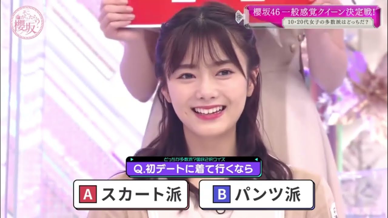 [音楽] そこまあったら 桜坂作今週も始まりましたそこ曲がったら 桜坂司会のサーブと本当は東京出身 ですそうだったさあそしてこいつらがさ ちゃん [拍手] [音楽] だ朝ご飯は パン ちっちゃいさあそれでは早速今回の企画 発表いたしましょう今回の企画は桜坂46 一般感覚クイーン決定 戦これまで様々な女王タイトルを決めてき た桜坂 46今回は世の中と同じ感覚や考え方を 持っている一般感覚に優れたナンバーワン を決める一般感覚クインを決めたいと思い ますあこれ大事ですねはい一般的なその 感覚っってのはこれ大事ですよねこの仕事 でねめちゃくちゃ大事だと思やっぱり共感 を生みますから人気出ますよそういう人は これ誰が強うとかもわかんないすよね わかんないですでもほらゆみ子会長とかは やっ下々の我々のことが分かっ てらっしゃいますかみたいなああ今日もね ゆみ子会場だけヘリコプターで来ました もんねDMCにれてるに大変でしょ確かに あとなんかハブとかもちょっとアホっぽく 見えるけども実はこの辺のバランス感覚 すごくあるんじゃないかと思っ確はあり そうだなうん分かってますねあごめん なさい撤回させてもらいます多分分かって ます変な返しが来ていましたけどファスト ステージはどっちが多数派国民2択 クイズこれからメンバーと同年代の女子が 答えたアンケート結果を元に作ったを出題 するので多数派を選んで ください3問出題し成績上位3名が決勝 進出となり ます予選Aブロックはこちらのメンバー さあそれでは参りましょう全員スタンド アップ おすいませんこれちょっと言いたかったん ですいません今から若子さん呼べるかな ちょっとちょっとねさあそれでは参り ましょう天のさんお願いします 問題海外ドラマを見るならA吹き替え派B 字幕派なるほど多数派はどっちでしょうか 10代20代の女性100人に聞いた アンケートでございますえさあそれでは ボードをお上げくださいどうぞあ難しいた あ割れてますね 嘘Bないわかんない完全に割れてるねおも え はい私が吹き替え派なのでなんで吹き替え 派な字で追いながら聞けないのでわかる なんかどっちかわかんなくなその点字幕派 田村B私絶対字幕ですドラマとか映画とか が配信するアプリとかめっちゃ多いじゃ ないですかでなんかそういうので見てる人 も多分結構同世代って多いと思っててそう いう人って韓国ドラマとかも見てるから うん確かに確かにその辺はもう字幕字幕だ と思ってますさあ多数派はどっちなん でしょうかえどっち正解お願いしますAA BABB BB字幕派字幕 派が多数と 67Bですね字幕派なんですね結構な差 ですね67と33%確かにねさあそれでは 続いての問題参りましょう天の公さんお 願いします問題 デトに来ていくならおAスカート派B パンツ派いやこれはも多数派はどっちじゃ さあこれねどう世代ですよ皆さんと代10 代20代の 女性100人に聞いたアンケートでござい ますそれではボードお上げくださいどうぞ え絶対こっちえこっちでってほしいこっち うオルAや女の子なら何これ長いスカート とかめちゃめちゃ楽ですえズボンの方が楽 じゃないのなんかズボンまとわりつくじゃ ないですか夏とかあそっかはいでパンツ 動きやすいですよね動きやすいよそれは ありますよねアクティブデートだったら まあなんなら変えてもいいですええ行き ますおが動いたお石は動く女 だ普通に一般的に見たらAだなと思って 選んだんですけど私は絶対にBなのでもう 買います自分は自分はそうなのはいうん どうなるのか関はBに行きましたさあタハ どっちでしょうかもう2回目から声出さ ない BAスカート 派はAスカート 派でも思ったよりパンツ多いそうです ね続いての問題は全員正解だったので2問 終わって前問正解だった6名の中から3名 を絞り込みます並んでる原田田村大沼関 カブ小林でサドンデス参りましょうサドン デスはあるアンケート結果の パーセンテージを当てていただきますより 数字が近かった人が勝利ということで ございますさあそれでは天の声さん問題お 願いします問題異性に告白する時直接する 人は何パセでしょううむうわえこれもだが 10代20代の女性100名に聞いており ますそれではおかきくださいめちゃくちゃ 短いですよシンキングタイムは短像のとは 全部嫌 です全部直接はやださあそれでは一斉に見 てみましょうオープンじんンおおお 4238-1 [音楽] あだから少ないってことだね少ないよね 少なそうかなて一番少ないか1番少ないす わで1番上が58おだったら行くってこと でしょいやわかんないですけどでもなんか LINEとかメールとかだったらなんか 無視されちゃったら怖くないですかああ 告白して高坂はどっちは直接ですが直接 はいえ行けんだそんなんは行けますね に落ちてはい行けますけますね誰だと思っ てんですかさあ見てみましょう正解は こちらお願いお願いお 願い [拍手] 85%肉食女子 だきだからやっぱメと向かってね坂高坂 だけ多分頷いてたもねみんなえって言っ てんのに坂だけそうね決勝寝