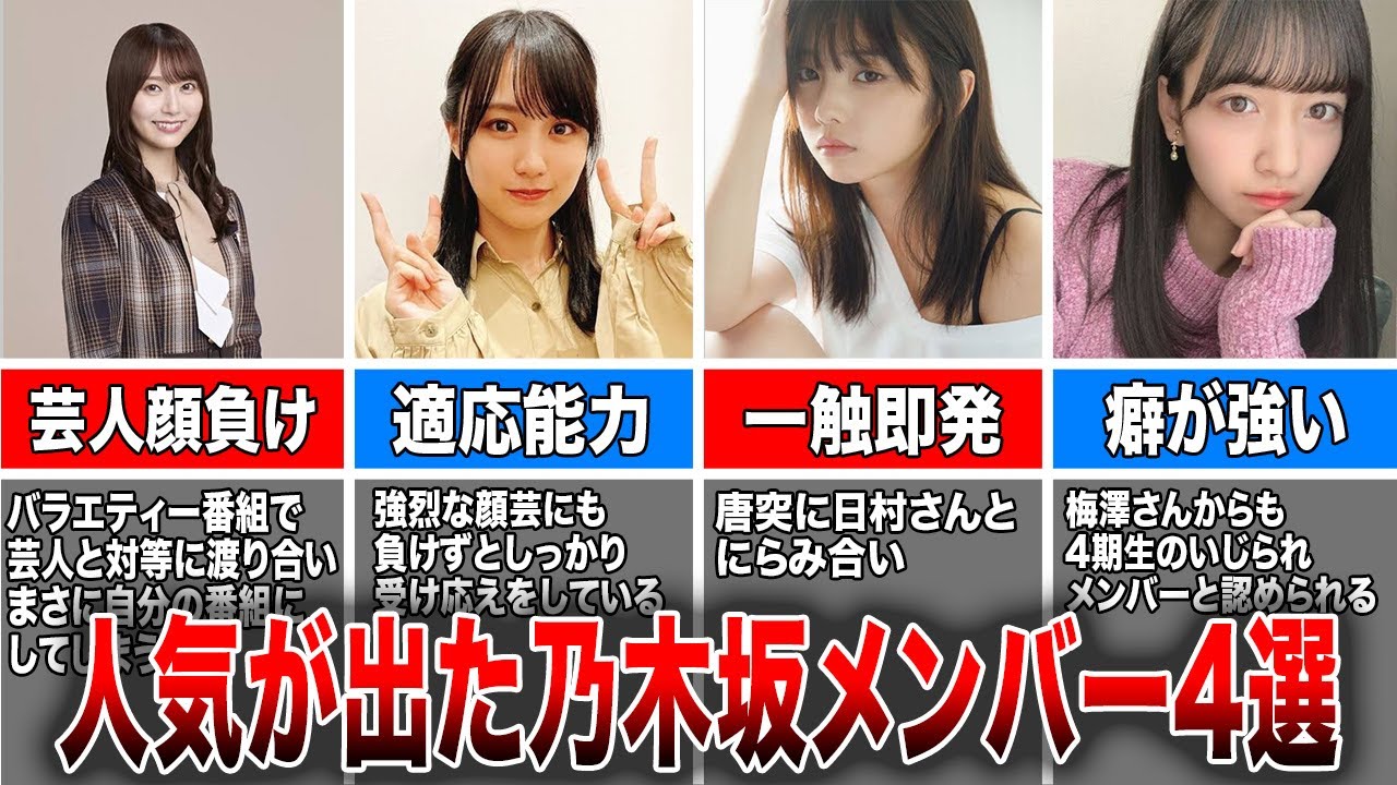 アイドル界のトップを走り続ける坂道 グループラジオ番組やテレビ番組に出演 することの多い彼女たちですがモデル撮影 や写真集の出版など幅広いジャンヌでの 活躍も見られます乃木坂でもアイドルとし ての歌声やダンスを評価されて人気な メンバーもいますがバラエティ番組で鋭い トークセンスや独特な個性を生かして 頑張っているメンバーもいますでは今回は バラエティ番組で人気が出た乃木坂 メンバー4選を紹介していきます 坂道グループが好きな方は是非チャンネル 登録をよろしくお願いし [音楽] ますまずは由木なおさんですバラエティ 番組で芸人と対等にわり合いまさに自分の 番組にしてしまうMCでありまた番組を 楽しむゲームプレイヤーとして番組を 盛り上げてい ます乃木坂由木とつちゃんゆきなさんの初 の冠番組毎回様々なことに という趣旨のも各分野の専門家が由木さん と乃木坂メンバーにその魅力を伝授すると いうものだそもそもラジオ番組はともかく 現在の乃木坂メンバーでこうした映像系の プログラムに自分の名前を関している メンバーはそれほど多くなく2019年 から2021年まで乃木坂の元メンバー 山崎麗奈さんが担当していた枠だったそれ を引き継ぐ形で同21年6月から始まった ものだがこの番組で特筆すべきなのはゆき さんの立位だ大概アイドルバラエティと 言うとその看板はアイドルではあるものの サポート役として登場する芸人が腕回しと 言うべき役割を担うだがゆきさんの場合は 芸人と対等にわり合いまさに自分の番組に してしまうつまりは紛れもなくMCであり また番組を楽しむゲームプレイヤーでも あるオンエアではネットがゆきざわわと いう言葉で湧いていたこの日は階段に闇と いうことで占い師でもありまた様々な怪談 を披露することで知られる島田修平さんが 講師として登場したそこで彼が伝授した怖 がらせるテクニックが効果音は絶対3回と いうものその上で例として後ろから急に コツンコツンコツンとコツン第に強めにし ていったこのアドバイスを受けて進行役加 のかやさんからじゃあゆきさんちょっと やってみますと振られるとなんと彼女は ざわわざわわざわわと森山亮子さんの佐藤 キビ畑の出だしを歌え出したのだ島田さん からお前いじってるよなと突っ込まれたと いう9月オンエアでは店頭によく置いて ある手書きポップにあみつこということで 先輩の鈴木綾さんと挑戦そこでは手書き ポップライターはまりさんの指導の元ゆき さんが初めて選抜メンバーになった30枚 目シングル好きというのはロックだぜの ポップを描くことになったのだが彼女が 描いたのは1期生から5規生までメンバー 全員の可愛らしい似顔が描かれたグループ アに満ちたものだったその真ん中にはこの 夏乃木坂をもっと好きになると書かれてい たそうしたバラエティにおける素質や人柄 は毎週金曜日の夜にアルコアピースと出演 しているラジオ沈黙の金曜日でも存分に 堪能できるがいずれにしても彼女が乃木坂 で果たす鉱石はなるアイドル好きが スライドしてゆきさんのファンになるので はなく純粋なラジオリスナーやバラエティ 好乃木坂のファンになるという全く別の層 から新規思ってくる力があるということ だろう独特な個性がバラエティ番組で評価 されているゆきさんはこれから目が話せ ません ね次はさん です全国各地のラジオ地方テレビに出演し 1年前と比べてコメント力やリアクション カメラの前での立ち振る舞いは見違える ほどに成長し た乃木坂工事中での企画に加え10月から 新番組乃木坂どへガスターとMCをサラバ 青春の光が務め4期生がオールロケの バラエティに8挑戦する番組でより メンバーの元の表情が見えてくるそこで 試されるのがバラエティ的応能力の高さ 秋本さんや高山かさん松村さゆさんなど 多くの先輩メンバーがバラエティ番組に 出演しているように将来4期生メンバーも 乃木坂を代表して1人で出演する時がある かきさんは全国各地のラジオや地方テレビ に出演し1年前と比べてコメント力や リアクションカメラの前での立ち振る舞い は見違えるほどに成長した乃木坂工事中デ エドさんと一緒に披露したミラクル マジックショーではバナナマン2人の烈な 顔芸にも負けずしっかりと受け応えをして いる緊張しいでしな遠藤さんと筒井さんを 支える形でかきさんが選抜に選ばれたのも 納得できるポイントですインタビューでご 規生の加入によりかきさんにも心境の変化 が3期生の先輩方が先輩に会ってもらって 嬉しかったことを後輩にしてあげたいと 思ったと言ってらっしゃった気持ちが今 すごくよくわかるんです私も4期生みんな で写真を撮っていた時先輩が後ろに入って ピースをしてくれていたことが嬉しかった のでご規制に少しでもリラックスして もらいたくて同じことをしてみたんです そういう時私も先輩になったんだなって 実感しましたと心に変化したことを語っ たかきさんの成長スピードはこれから 乃木坂を支えてい