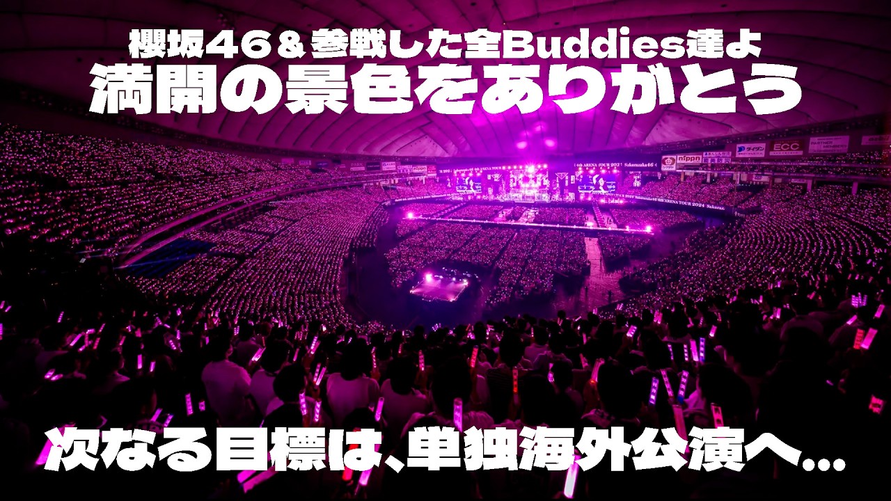 約2年前桜坂46は東京ドームという名の 桜の木でライブをしたしかしそこで桜の花 が満開になることは なくメンバーやバディーズという名の桜の 花はとても悔しい思いをし たそこから月日が流れるにつれて偉大な桜 の花びらたちが空を点高く舞い空から 見守る月となった そして新たな桜の花となる3期生や新山者 のつぼみが現れ た2024年6月15日16日再び東京 ドームでライブが行われた今までの努力の 結果桜の木は満を迎えることができ たは 世界で1番大きな桜のを満 に桜坂46ありがとうそしてこれから 私たちバディーズをよろしくお願いします