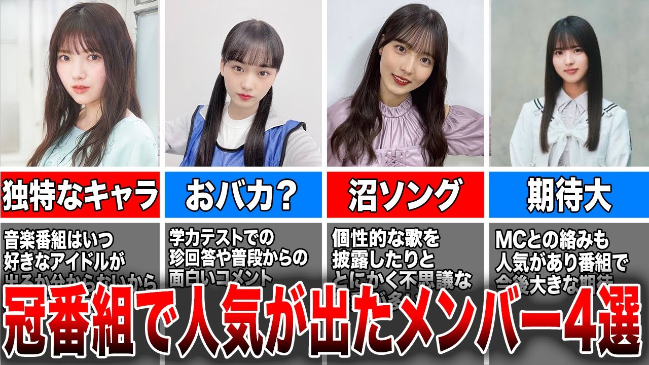 アイドル界のトップを走り続ける坂道 グループ坂道グループでは各グループごと に冠番組がありチームの特色を生かした 内容となっています桜坂でもアイドルとし てダンスや過小力で人気を掴んだメンバー もいますがカ番組でトーク力や個性を評価 されて人気の出たメンバーもいますでは 今回は冠番組で人気が出た桜坂メンバー4 選を紹介していきますまた坂道グループが 好きな方は是非チャンネル登録をよしお 願いし ますまずは上村リナさんですそこ曲がっ たら桜坂でアイドル好きの上村さんが1番 好きなアイドルを明かしたそんな独特な キャラが人気につがっているのではないか と言われていますそこ曲がったら桜坂で アイドル好きの上村さんが1番好きな アイドルを赤したこの日の番組では教えて 桜坂プライベートQ&Aと企画を行い各 メンバーの趣味思考を掘り下げて紹介した メンバーに様々なアンケートを実施した中 毎週見ているテレビ番組に20番組以上も 書いたという番組名には乃木坂工事中長 乃木坂スター誕生などの音楽番組がずらり と並ぶアイドルが好きだという上村さんは 音楽番組はいつ好きなアイドルが出るか 分からないから毎週録画していると言い 1番好きなアイドルわれると乃木坂さん ですと回答したまたメンバーの井上りな さん大沼明穂さん竹本ゆいさん増本キさん が出演しているさミーツのファンだという 上村さんは1回も欠かさず似てますと回答 その魅力を問われると面白くてみんなが 頑張っている姿がグっときてスケジュール 知ってるじゃないですか同じグループなの でこんなに朝早から夜遅くまでやってるん だとメンバーの頑張りに感動していると いう数多くの番組を録画しているため ツアーに行く時は頑張って消して ハードディスクの容量を開けていきますと 苦労を明かしていたそんな独特なキャラが 人気につがっているのではないかと言われ てい ます上村さんの独特なキャラを生かして これからも頑張って欲しいです ね次は山崎店さ ですそこ曲がったら桜坂での学力テストで の賃回答をたくさん残しています山崎さん の力テストでの賃回答や普段からの面白い コメントが彼女の人気につがっているので はないでしょう か事前特番ではメンバーが過去の放送会を VTRで振り返り名馬面クイズやゲーム 対決に挑戦クイズをきっかけに当時の意外 な真実が明らかになる配信が始まる前に 竹本ゆいさん松田奈さん山崎店さん谷口 ありさんの4人にインタビュー同番組への 思いを語ってもらった他印象に残っている 企画や辛かった企画なども聞いた松田さん はこれまでで印象に残っている企画や場面 はみんなに笑ってもらえたなっていうのが そんなつもりでもなかったんですけど イチゴの下手を食べた時にすごく笑って もらえてそれがすごく嬉しかったのと自分 も楽しかったですちょっと迷いもあったん ですけどオレンジの皮も初めて食べられた し収録が終わった後にもうあれ本当に笑っ たって言ってくれるメンバーもいたので私 の中では結構いい会だったんじゃかな思っ ていますと話山崎さんは私は輝きたくて 輝いたわけじゃないんですけど学力テスト がそれに対して松田さんがそれはそうだね 輝きたくはないよねと話しました山崎さん はできるだけ輝きたくはないんだけどどう しても輝いちゃう悪い方ですけどでも たくさん面白がってもらえるのでまあ 良かったかなと思いますと会場を笑いに 変えた再を争っていたみさんが卒業されて しまったので山崎さんは藤吉さんとかも 結構近い順位にいたんですけどこの前は 藤吉が勉強しちゃってすごく順位が上がっ てしまったのでまあ村山ちゃんかな次なる ライバル候補は村山ちゃんに頑張って もらおうかなと思っていますとこれからの 番組に対して期待を語った山崎さんの学力 テストでの賃回答や普段からの面白い コメントが彼女の人気につがっているので はないでしょう か山崎さんの面白いコメントが番組を 盛り上げていると思いますこれから たくさんの番組に出演して盛り上げて 欲しいです ね次は大沼明穂さん ですそこ曲がったら桜坂で強烈な インパクトを残しているのが大沼明穂さん です大沼さんはまだセンターに選ばれた ことこそありませんがとにかく個性的体力 測定に超全力で望んだり沼ソングと呼ば れるあまりに個性的な歌をしたりと とにかく不思議な行動が多く司会の土田 さんや沢さんを爆笑させてきまし た各メンバーがバラエティ番組できっちり と存在をアピールできればそれがグループ の知名度や人気の上昇につながりさらに 仕事が増える高循環が生まれる本業の歌 だけでなく個々のメンバーのバラエティで の活躍は非常に大切だが桜坂には とっておきの秘密兵器がいる坂道グループ はそれぞれテレビ東京で日曜深夜に番組を 持っていますが桜坂の番組そこ曲がったら 桜坂で強烈なインパクトを残しているのが 大沼明穂さんです大沼さんはまだセンター に選ばれたことこそありま