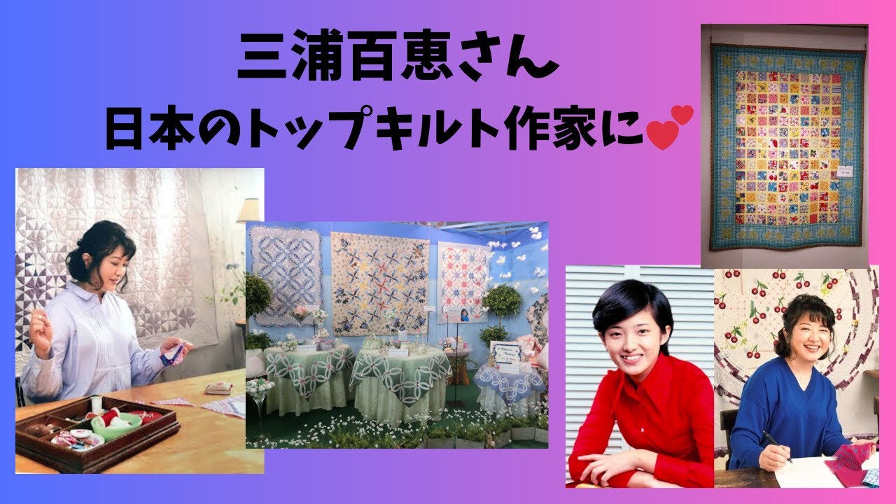 1980年人気絶頂の中21歳で結婚引退 した歌手の山口もえさん芸能界復帰の噂は 何度もありましたが表部隊を去ってから 40年彼女が再びマイクを持つ機会は未だ にありません主婦業に専念している桃さん がキルトの制作を趣味にしていることは ファン以外の方にも知られていますしかし それ以外の情報は謎に包まれてます桃さん がキルトの制作を趣味として始めたのは 1987年頃と言われています友人からお 子さん用のベイビーキルトをプレゼントさ れたことがきっかけだそうですベイビー キルトとは生まれたばかりの赤ちゃんを くるんだりオム交換の時に敷物として使用 されたり大変重宝されます家の中で 楽しめる趣味になるとともに家族に自分の 作ったものをプレゼントできるとキルトに 意欲的に取り組んだもえさん日本を代表 するキルト作家の橋澤れい子さんに学び いつしか先生として友人に教えられる腕前 になったのだとかキルトは細かい布を 縫い合わせるだけではなく配置や配色など にも気を配らなければなりません編み物の 縫い目は人の人格を表すと言われることが ありますがもえさんの作品の縫い目は まっすぐで全く乱れがないのことそんな もえさんの作品は2002年から開催され ていた東京国際キルトフェスティバルに 毎年出品されるようになりますもえさんの 日常の中でどれほどキルトが大きな存在に なっているかが分かるエピソードが たくさんありますね女性たちの視線の先に ある タペストリー180cm下140cmと いう大きなキルト作品だが水色の大きな枠 の中には色鮮やかで足したような布が 縫いつけられているタイムトラベルと題名 を添えた作者は三浦桃さんおよそ3年ぶり となる新作が展示されたのは3月下旬に 東京中野区で開催されていた展示会橋澤 令子のキルトフェスタ 2023長い年月で頂いたものが増えこの 可愛いプリント布を何とか生かしたいと シンプルに仕上げましたこののはあの時に これはあの人がとくださったとや頂いた時 を思い楽しく温かな気持ちで針を進められ ましたなんとこれまでに友人たちから送ら れてきた布をつなぎ合わせて作品を仕上げ たという桃さんの人となりがとてもよく 表されていますね元々決して裕福とは言え ない家庭環境で育ったもえさんは慎ましく 生活することをしけられていましたキルト の政策においても記事は必要な文だけを 買いなるべくあまりを出さないよう心がけ ているそうですそして2019年には結婚 以来作り続けた作品70点とそれらに込め られた思いを綴った著書時間の花束が発売 されましたこの中には近年撮影されたと 思われる桃さんの写真も掲載されており 若々しくも穏やかな表情が印象に残ります 華やかな芸能人オーラというよりも 日だまりのように温かさに満ちた写真です 間接的ではありますが今の生活がとても 満たされているとを伝える意図もあるよう に思われます改めて芸能界復帰を否定した ように感じた方も多いのではないでしょう か2021年にはつま子が生まれた桃さん は周囲の友人に孫にキルトをプレゼントし たいと打ち明けているそうです一体どの ような思いを込めてキルトを作っているの でしょうこれからもキルトを通してその時 の桃さんの心情を買いまみる機会がある はずですキルト作家である三浦もえさんの 活躍にますます注目が集まりそうですねお 2人の住まいが東京とたく国立市にある ことは以前から有名でし たえさんは友和さんのご両親の介護を完璧 にこなしておりっった母さんののように なっていると報道されたこともあります しかし現在義両親の介護が人段落して施設 に入られたとのこと桃さんが芸能界引退 直前に執筆した著書青い時にこんな記述が あります彼という素晴らしい人を産んで くださったご両親を心の限り大事にしたい こんな言葉はドラマの中でも聞いたことが ありません強い決意を浮ついたところ とした言葉で綴ることができる桃さんは がっこいいですよねその通りの時間を 過ごし人生の次の段階に進まれたようです 時を同じくして長男の三浦裕太郎さんに第 一師が生まれました桃さんはおばあちゃん になったのですねすでに長男夫婦も自宅で 同居しているという情報もあります結婚後 の桃さんを知るうちにこれからも幸せなを 化していただきたいと強く感じるように なりましたキルト作家として素敵な作品を 作り続けていただきたいですね