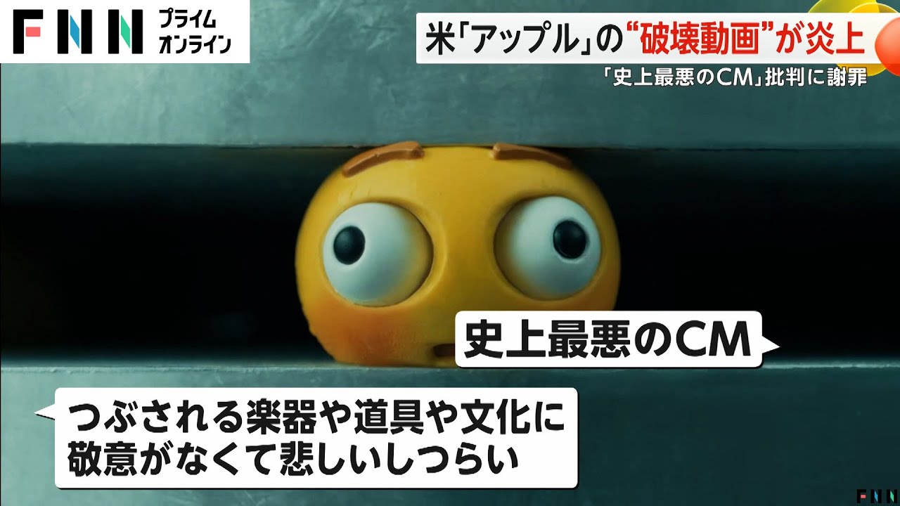 Appleの新製品プロモーション動画に 波紋が広がっていますこれは7日に発表さ れたAppのiPadProのおよそ1分 の動画です巨大なプレスの上には トランペットやピアノなどの楽器を始め 絵の具や彫刻カメラなど様々なものがあり 次々と潰されていき ますギターは 破裂はびしてしまい ますそしてプレスが引き上がると新しい iPadProが現れるという演出で ナレーションでは市場最強のiPadは 史上最も薄いとアピールしてい ますこの動画のタイトルはつり クラッシュしかし全てのものを潰していく 様子が破壊的であると批判が高まりSNS で炎上したのです 潰される楽器や道具や文化に経緯がなくて 悲しいし 辛い史上最悪の CMAppleは新機種の薄さや多機能を 伝えたかったようですが街の人 はインパクトがあっていいなって思ったん ですけど楽器やってる身からするとこう その潰されている楽器がいそうだなって いう回ですね楽器が凝縮されていくんだっ たら何か吸い込まれていくとかそういう 表現だともうちょっと柔らかいかなとま 表現はま自由だしまいいんじゃないかなと は思います けどこの動画はネット上でまだ視聴でき ますがアメリカのAppleは9日この 動画は的を外していました申し訳ありませ んと批判を受けて 謝罪テレビで広告を流さないことを決めた ということです
