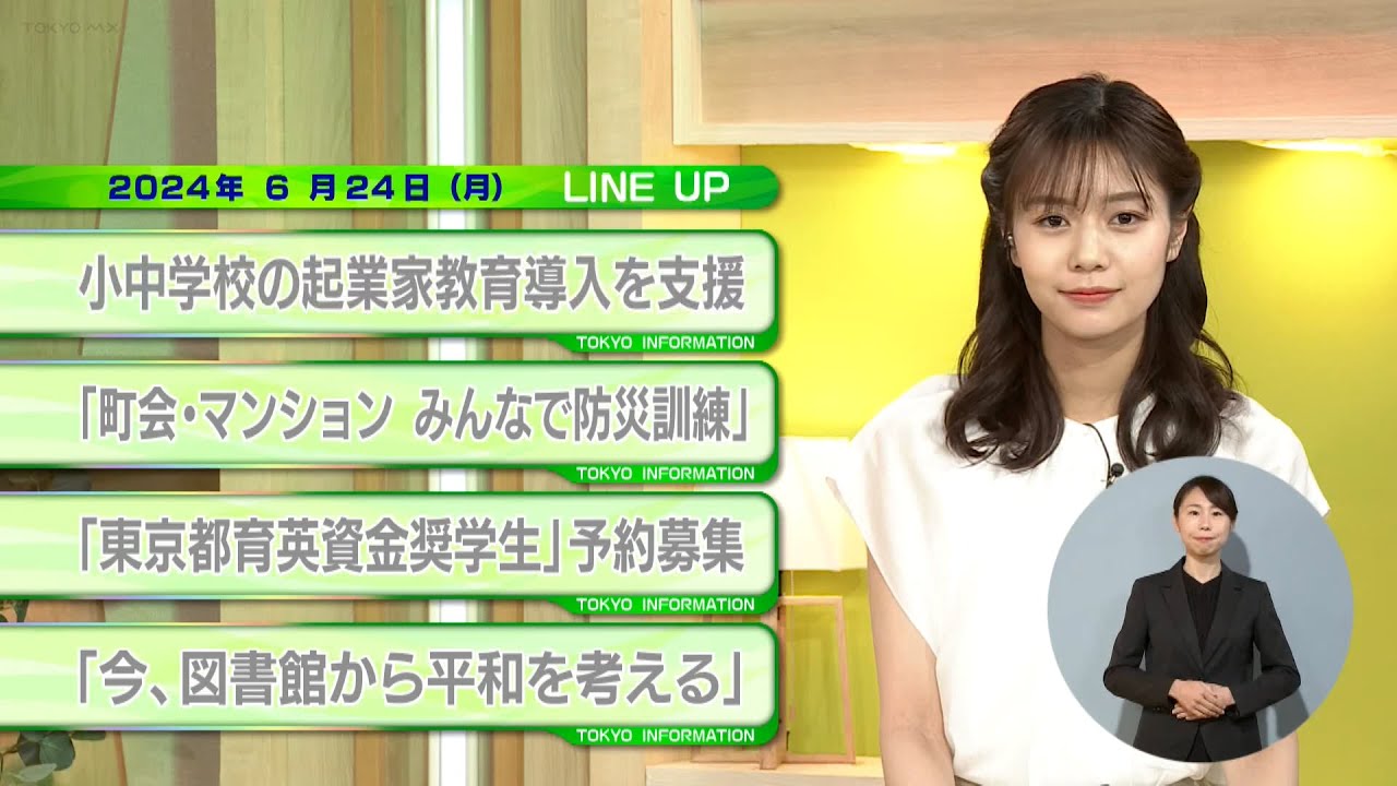 [音楽] おはようござい ます6月24日月曜日の東京 インフォメーション です東京都は都内の小中学校を対象に企業 家教育の導入を支援します 小中学校向け企業化教育推進事業は2年度 にわたってサポートが受けられ ます今年度の策定支援ではプログラム説明 会の開催やプログラムの策定支援が行われ ます来年度の実施支援では協力企業などの 提案や交渉担当教職員へののアドバイス などが行われ [音楽] ます募集校は都内の小学校及び中学校で 効率私立は問われません支援項数は10項 で審査により決定され ます申請は専用ホームページの申し込み フォームから11月29日金曜日までにお 申し込みください [音楽] とは地域における繋がりを構築するため 町会自治会とマンションが合同で実施する 防災訓練を支援し ます町会マンションみんなで防災訓練の 対象となるのは近隣のマンションとの 繋がりを構築強化したいと考える都内の 町会自治会です連携可能なマンションは 管理組み合いを有する分場マンション です合同防災訓練に向けて合同打ち合わせ と事前レクチャーが行われ訓練後には 振り返りが実施され ます合同打ち合わせから帰りまでを専属 担当者が駆町村や消防書と連携して奏支援 し ます訓練の実施期間は10月1日火曜日 から来年の2月16日日曜日まで です申請は朝会自治会からのみで第1回が 今日24日月曜日から来月5日金曜日まで Eメールでお申し込み ください東京都市学財団では東京都育資金 貸し付け事業による小学生の予約募集を 行い ますこれは勉学意欲がありながら経済的な 理由により高校などでの修学が困難な人を 東京都育資金小学生の採用候補者として 先行しあらかじめ登録する制度 です対象は都内に住所があり来年4月に 高等学校などに進学を希望する中学3年生 です貸付期間は来年4月から在学する学校 の修業年間までで高等学校などに進学した 5月からの貸付け開始となり ます貸し付け金額は国交率が月額 1万8000円市率が月額3万5000円 を無理子で貸し付け ます在学する中学校で申し込み書類を 受け取り学校を通じてお申し込みください 東京都教育委員会は朗読会トークイベント 委都立中央図書館今図書館から平和を 考えるを開催し ますこれは俳優の近野みさ子さんによる 朗読会と都立図書館の名誉 長さんとのの大切さ本との出会いなどを 対談形式で語るトークイベント [音楽] です来月13日土曜日午後2時から3時半 まで都立中央図書館4回の他目的ホールで 開催され [音楽] ます対象は小学生以上で募集人数は100 人程度です応募多数の場合は抽選になり ます 参加を希望する人は申し込みフォームから 今月28日金曜日の午後5時までにお 申し込み ください今日お伝えした内容は番組の ホームページにアップしていますのでご 活用 くださいここまで東京インフォメーション でした