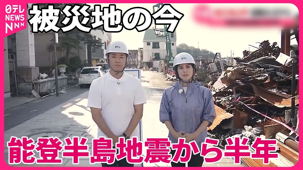え大規模な火災があった和島市の朝市通り に来ていますえこちらでは6月上旬から 後ろに見えます大きな重機を使ったコヒ 解体え取り壊しの工事が行われていますえ 死によりますとほぼ毎日工事を行っていて 今日もまさにこの奥の場所で取り交わし 工事が行われていました瓦礫の撤去その後 基礎の解体を進めていくそうなんですが 全体の終了の目土は立っていないという ことですあの私は1月と2月にこの火災 現場に来たんですけれども当時は立ち入り 規制されていてここの場所にも入ることは できませんでしたえ近づいて見てみますと この足元には黒く焼け焦げた食器が残され ていますここに暮らしがあったことを 物語っていますえ斎藤さんはこの場所に 今日初めて来てどんなことを感じています かはいあの地震当時はまだキャスターと いう立場ではなくてま視聴者として報道を 見ていたんですけどもま実際にこう来て みると家事の規模の大きさを実感しますし この元通りになるまでの時間っていうのま 道のりですねそれが本当にこう考えると 言葉を失ってしまいますねそうですねえ そしてこの通りの反対側に目を向けてみ ますえ多くの店舗などが今も地震当時の ままの状態で残っていますねはい実際に こういった大きく倒壊したままの建物を 当たりにすると地震から半年間時が止まっ てしまったようにも感じますねはいえ一方 でこちらの建物に貼られている応急危険度 判定は危険と書かれていますえ当時は 真っ赤な鮮やかな色をしていたんですがえ 半年の間日にさらされまして色が白に変色 していてこの半年という時間の経過を感じ ますえこの地震より和島市では130人の 方が亡くなっていますまた和島市では今も 313人の方が避難生活を余儀なくさい ます私たちは今日和島市の中学校を取材し まし たこの中学校では被災して校舎が使えなく なった和島市の小学生が校舎を借りてここ で勉強をしています てる王子ねそうそうカおじさんじゃないよ 王子ねこの街がこれからどんな風になった はビュー れしておいおいおい あの元の学校でね マなんか仲良くなんか授業できたらいいな 男があの今解消されてあのなんかなんか 金沢とか言っとる人が戻ってくればいい な子供たちの笑顔が見られた一方でま それぞれに悩みを抱えていることを感じ ましたまこの中学校は避難所にもなってい て今日時点で40人の方が避難されてい ますうん斎藤さん避難所の現状取材して どうでした かはいま避難者の方からはえ長引く避難 生活でま疲れが溜まっているただその一方 で気を張っているからあまりその疲れも 感じないという声も聞かれましたえ徐々に 仮設住宅からこう出ていかれる方もいて こう避難所に取り残される感じがすると いう声も聞かれましたうんうんねと徐々に 避難所から仮説住宅へ今移っていっている いう状況なんですがその避難所で久々に私 再開できた方もいたん です1月末に私は和島市の一時孤立した 地域で炊き出しをしていた料理人の富成 さんを取材していまし たえその富成さんは今日訪れた中学校でも 今も炊き出しを続けていまし た今日で半年なんです が今年の時間はどんな風に感じましたか僕 の生きてきた人生の中で1番濃かった半年 と言いますかちょっと精神的に病んで しまってええそうな3月一ぱいちょっとお 休みいただいたんですあとま自分の将来の 不安だったりっていうのはやぱ夜1人で 考えてたりっていうところでうんやっぱり 精神的な負担が大きかったのかなっていう 風にはずっとこう炊き出しを続けてる思 いっていうのはどんなところからなんです か避難所にいる皆さんはやっぱり皆さん家 失ってたりそれぞれ大変な思いをされてる 方がすごく多いのでやっぱりその皆さんの 力になりたいと言いますかませめて避難所 の生活の中で食事の時間だけは楽しい時間 になってもらいたいなっていう思い であの和島市内の避難所は8月一杯で全て 閉鎖の見通しで被災された方々は仮設住宅 や一部損害している自宅での避難生活へと 徐々にシフトしていっている状況なんです まそうした中で心配されるのが長引く避難 生活の負担などが原因でなくなる災害関連 士の増加です野半島地震で亡くなった 299人のうち災害関連士は70人に登っ ています実は石川県全体で災害関連士の 認定を求めるご遺族からの申請は200人 あまりあることがわかりましてえ今後 亡くなられた方の人数はさらに増える可能 性がありますえこの認定は被災自治体が それぞれ行うものなんですが自信の被害が このように大きかったことや認定作業を 行う人の確保や調整にも苦労し時間が かかっていると言います被災されている方 の多くが思うように生活再建ができてい ない中でお1人お1人が抱えている困り事 やストレスが今見えづらくなってきてい ます斎藤さんこの先の災害関連手を防ぐ ためにも地域での声かけや外からの ボランティアなど多くの支え合いが必要と 感じますよねそうですねあの今日も暑