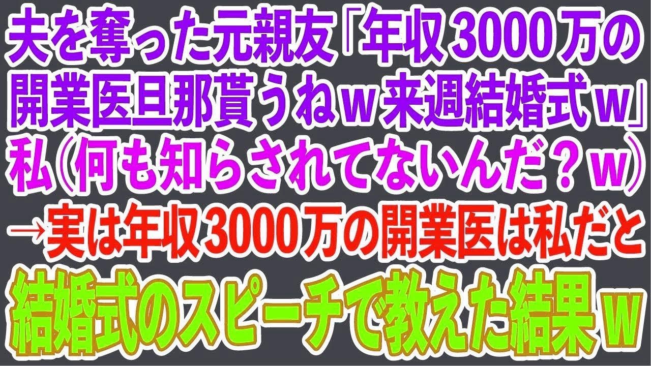 【スカッとする話】夫を奪った元親友「年収3000万の開業医旦那貰うねw来週結婚式w」私(何も知らされてないんだ?w)→実は年収3000万の開業医は私だと結婚式のスピーチで教えた結果w【修羅場】