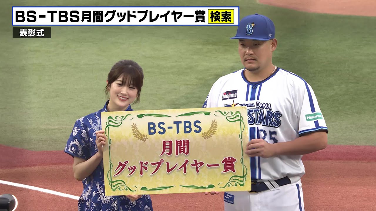 bstbsでは今シーズンも横浜DNA ベイスターズの選手を対象にファンの皆様 からのポストを参考に選出するあなたが 推薦bstbs月刊グッドプレイヤー賞を 実施しています5月のグッドプレイヤーに は復帰初戦で逆転3ランホームランを話し さらに5月11日の阪神戦では日米通算 225号ホームランでチームを劇的逆転 勝利に導いた号選手が出されまし た試合前には表彰式が行われbstbsで 毎週月曜夜10時放送中の町中華でやろう ぜに出演している元乃木坂46のさんから 賞金が手渡されましたなおファンの皆様は xを利用し投票に参加すると抽選で4k テレビやサインボールなどが当たります 詳しくは特設ホームペジをご覧くさい やろぜのレギュラーに私が新にわりました 曜夜10時見て ください怖いこれは飲みすぎちゃう