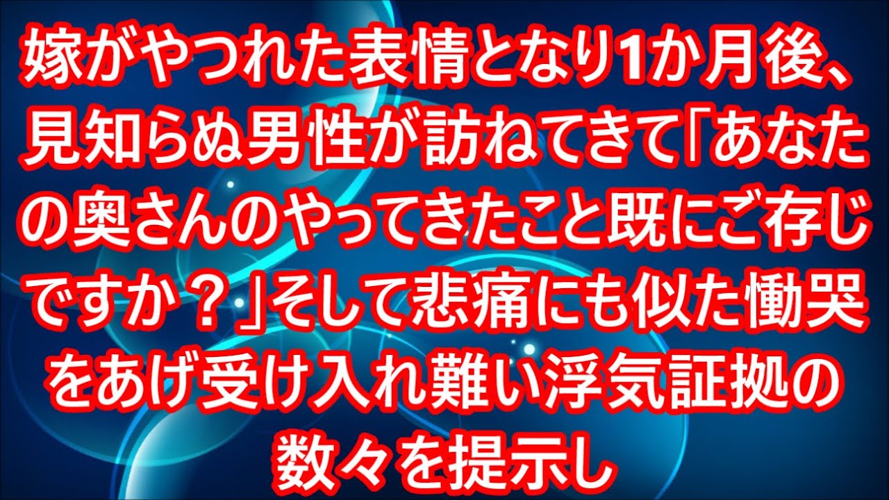 嫁がやつれた表情となり1か月後、見知らぬ男性が訪ねてきて「あなたの奥さんのやってきたこと既にご存じですか?」そして悲痛にも似た慟哭をあげ受け入れ難い浮気証拠の数々を提示し…
