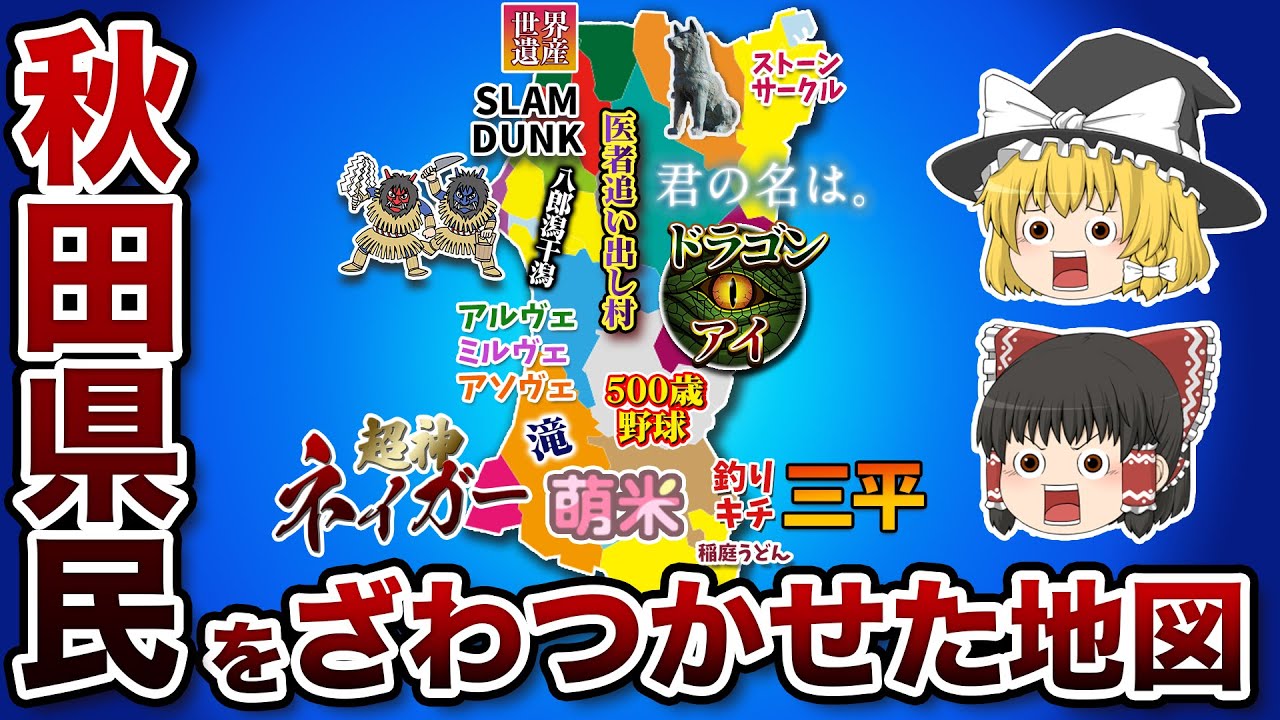 生はげ八光秋田美人もう秋たなんて言わせ ません秋田けのよくわかる地図を解説あ 霊夢にそっくりなお面を見つけたぞ ちょっと見せてちょうだいは何よこれこれ を私って言うのそっくりじゃないか怒った 顔とかひどすぎるわよ魔理沙もう絶好よ ごめんごめん言いすぎてしまったな今回 紹介する剣はこのお面と繋がりがあるんだ ぜこの怖いお面と繋がりお面と繋がりの ある剣はここだドドンどこだか分かるか こういう形の県って結構あるような気が するんだけど日本海側の剣かしらこれは 秋田県だぞこのお面あ生はげのお面よね っていうか私が生はげひどすぎるんじゃ ないのそして解説に使うのはこちらドドン 毎度お馴染みのよく分かる地図シリーズね そうだこの地図に沿って秋田県を解説する ぜよろしくお願いするわそれでは ゆっっくりしていってね基本 情報まずは秋田県の基本情報を紹介するぜ ウ秋田県は東北地方の日本海側に位置し 西尾日本海東尾白神さん地に囲まれている ぜ県庁所在地は秋田市東京からだと新幹線 で約4時間車だと7時間半くらいかかるん だぜ思った以上に時間がかかるわね秋田県 は青森岩手山形県と接しておりほんの ちょっとだけ宮城県とも接してるぞほんの ちょっとあ本当にほんのちょっとね県外 から秋田県に入るには山々を超えていくの で時間がかかってしまうんだぞ地形的な 理由だから仕方がないってわけね人口は 91人面積は 1万6000平km全国で6番目に大きな 県なんだかなり大きい県なのね隣の岩手県 も大きいんで大きさに気づかないかもしれ ないがかなり大きいんだぞ東北地方は みんな大きいってことかしら意外すぎて 驚きだわ秋田県出身の有名人は少ないよう で結構多いんだ女優の佐々木のぞみ俳優の 柳場郎元乃木坂46のイコマリナだぜ 佐々木のぞみさんやリナさんはまさに秋田 美人って感じよね秋田美人というイメージ をさらにアップしてくれる感じだぞ柳場 敏郎さんといえば踊る大操作戦シリーズの 室井シジ役その印象が強いかもしれない けど素朴で素敵な人よね紹介しきれない ほど有名人がたくさんいるぞあなたが思う 秋田出身の有名人についてコメント欄に 書いて欲しいぜ意外な秋田出身有名人が出 てくるかもしれないわねさてここからは よく分かる地図を使って秋田県を紹介する ぜヒヒよく分かる地図鼻の穴かっぽじって よく聞くわそれを言うなら耳の穴な 八光八光って渋谷にいるじゃん八光と秋田 には深い深い関係があるんだぜ八光と秋田 県の関係でこの八光の場所ってどこなの かしら大館氏だ大館氏大館氏は天北に位置 しており青森県と県境を接しているんだ 特産品は切り担保に曲げわっぱそして八光 なんだぞ八光を特産品というのはどうかと まあそういう細かいことは気にするなち ちなみに八光は秋田県という犬種だぞわあ 八光みたいなワンチャンがたくさんいるわ ね渋谷駅に鎮座している八光像のモデルに なった八光は1923年に大館市で生まれ ているんだというと生きていれば100歳 犬の寿命から考えると100年生きるのは 難しいが生誕100年過ぎたんだぞ八光 ってご主人様が亡くなっても駅前で待ち 続けていた犬でしょ秋田県ってみんなそう いう性格なの知られている性格としては 我慢強い飼主や家族を大切にする警戒心が 強いのが特徴だだから飼主を待ち続けられ たのねきっと八光は飼主の先生が大好き だったんだろうだからずっと待ち続けたの ね泣けてきちゃうわああ私も八光みたいな 人に出会いたい人間だったらストーカーだ ぞそそれは遠慮しておくわ大館氏は八光の 故郷ということで八光なんだぜ了解世界 遺産世界遺産は日本にたくさんあるけど 秋田県で世界遺産ってどこなの八方町と 藤里町だぞ県最北の場所でありここで紹介 する世界遺産は白神さ地だ白神さん地名前 は聞いたことがあるけど実際どんなところ なのかスパパンなんでビンタするの痛いん ですけど日本のことそれも世界遺産くらい は覚えておくべきだぞいたたたたじゃあ 勉強するから教えてよ秋田県と青森県に またがる約13ヘクタールの広大な産地体 の総称だこの広大な産地体にある林が世界 自然遺産に登録されているぜ日本最大の原 的な林であり日本国内登録されてるのは4 箇所だけだそれはすごいことなのね多様な 植物と動物が生息し林は東アジア最大級の 規模だぞ白神さ地は集落から遠く離れて おり大昔からそのままの姿で維持されて いるんだタイムスリップした感じかしら トレッキングスポットとしても人気だぜ滝 や湖などもあるのでマイナス異音を浴び まくりだなストレスだらけの現代人には きったりぜひ行ってほしいわね私もその うち行こうと思ってるぞどうしてそりゃ ストレスの元が目の前にストーン サークルストーンサークルって巨石の建造 物よねああそうだぞ霊夢よく知ってたな 世界遺産よりも世界7不思議的な話の方が 私は好きなのよストーンサークルで有名な のはイギリスのストーン返事だが秋田県に もストーンサークルが