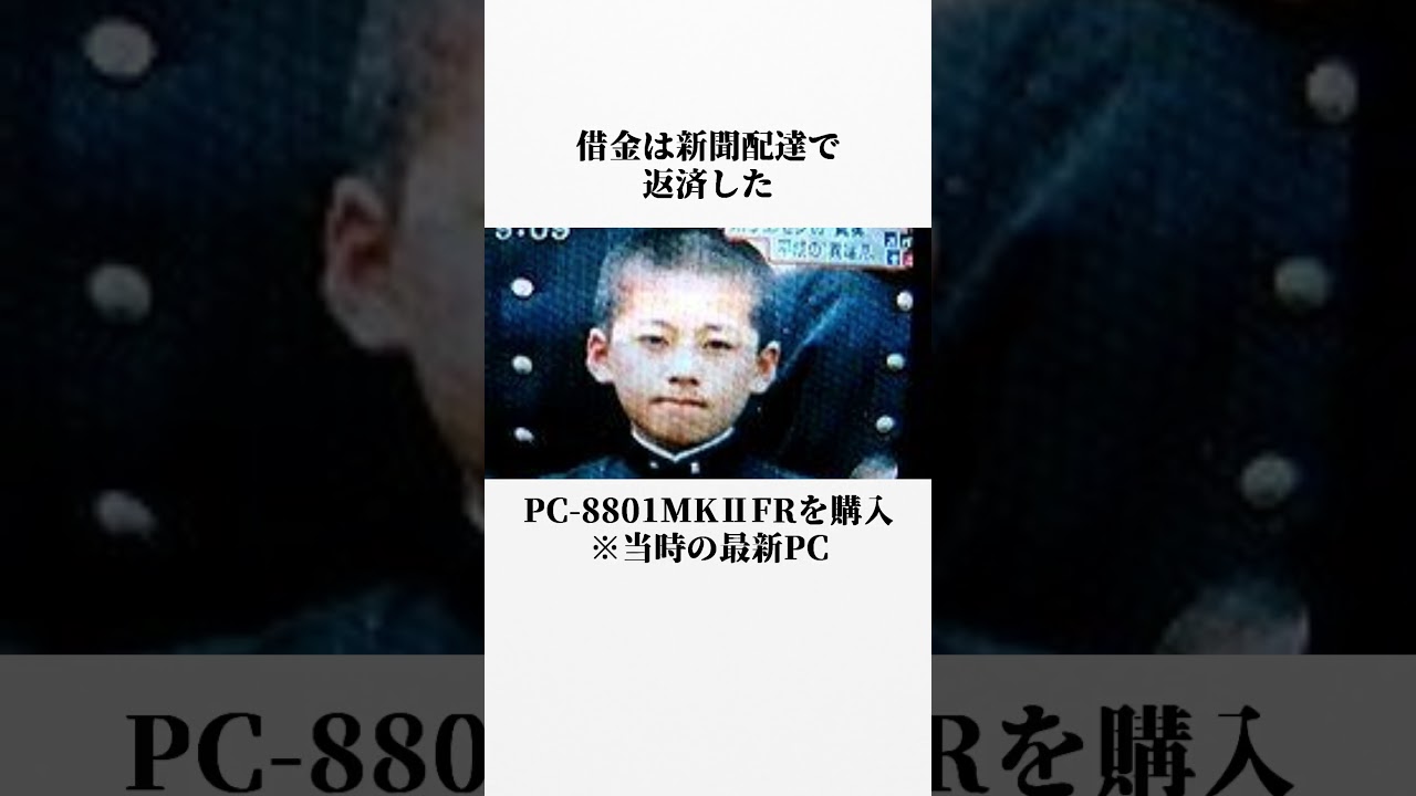 ホリエモンは新道と呼ばれた5歳の時の 愛読書はひった時点小学校の算数のテスト は10分で時終わり同級生のテストを採点 していたそんな堀江が賞賛の時同級生に 悲惨で負けた負けずらの堀江少年は何し たらそんなに早くなるのと問い詰めた答え はく厳しい母親を説得し問に体験入学体験 入学でくもの本質に気づきこんなの意味 ねえとその日に辞めた中学高校はく大付設 勉強に飽きた堀江はパソコンにはまる中二 で親からに万の借金をPC8801M系に FRを購入借金は新聞配達で返済した パソコンにはまりすぎて大学受験の半年前 成績は学年は明と2まで落ちたしかし ながら東京に行きたいから東大進学を決意 1日14時間勉強して無事東大に合格しい 中から脱出できた東台時代またパソコンに はまりオザエッジ企業と共に東台を中退し た頭の良さは親の遺伝と聞かれた堀江は俺 の知能は遺伝子のバグだよ親が茶なんか ないよと笑って答えた