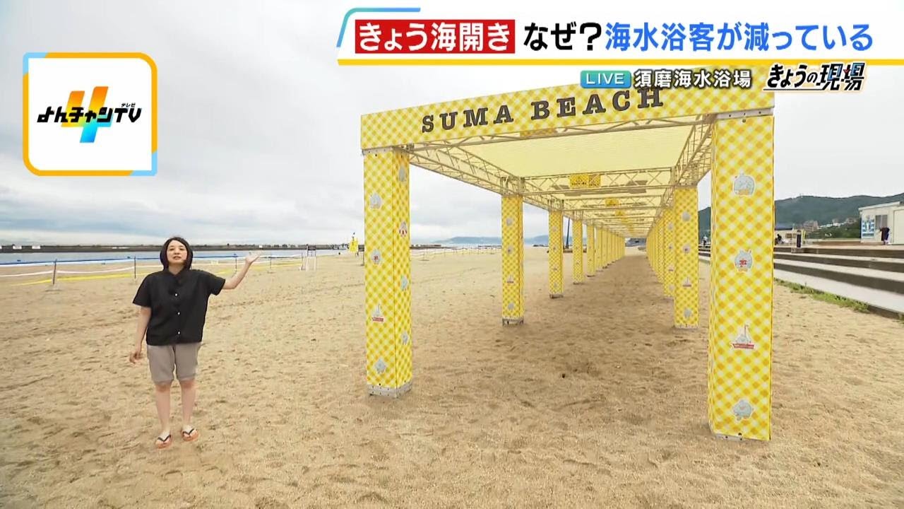 7月11日(木)に海開きした神戸・須磨海水浴場から、MBS藤林温子アナウンサーが生中継。「スマイルビーチエリア」では、小さな子ども連れの家族なども安心して泳げるよう、クラゲよけネットを設置し、お酒の持ち込みや飲酒を禁止しています。