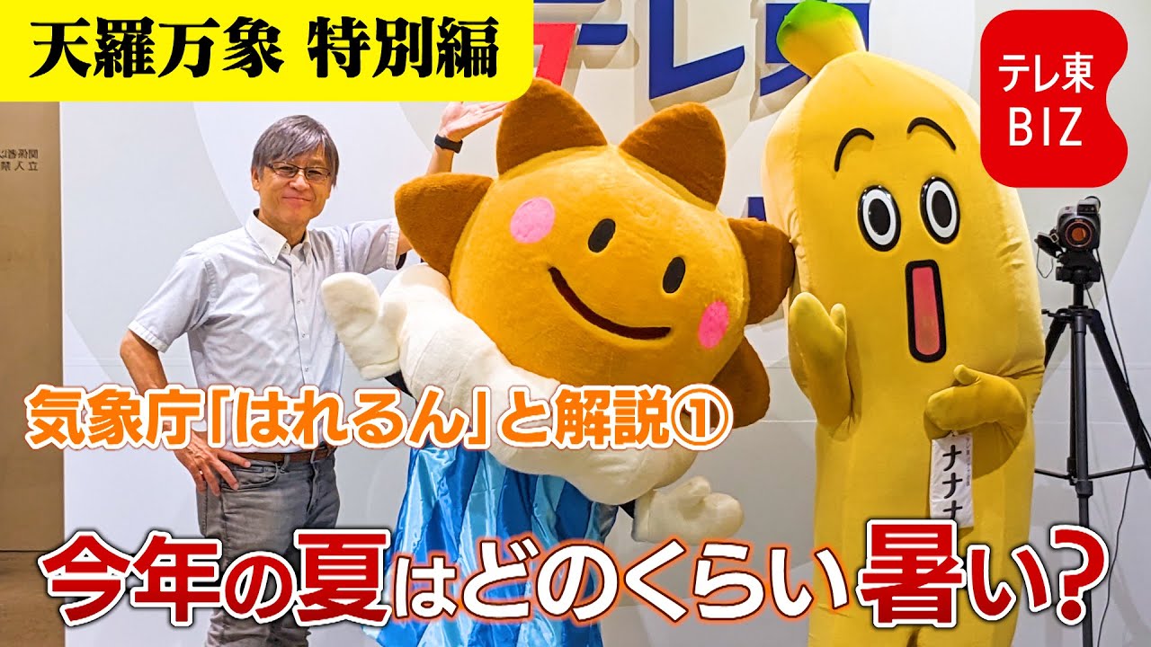 こんにちはえテレビ東京解説員そして気象 予報師の久保田マサですえ今日は天羅番長 のちょっと番外編ということでお伝えし たいんですけども素敵なゲストをお迎えし ていますこちらえ気象庁のマスコット ハレルテレビ東京に来てくれましたそして まですからテレビ東京からもえ謎のバナナ 社員ななが登場でありますえお2人とも ようこそ来てくれました ありがとうさてえ気象庁はですね全身の 東京気象台があ明治8年1875年の6月 1日にえ東京気象台としてですねえまその 観測を開始して来年で150年なんですね で6月1日というのに観測が始まったので それが気象記念日としても現在も続いて いるんですが実はハレルは今年のですね6 月1日の気象記念日で二十歳の誕生日を 迎えたんです二十歳だっ ておめでとう に7は11歳ですはいえそんなことなん ですけどもあのハレルよく見てくださいお は太陽村源は雲そして下はこれ雨ですよ雨 ちょっとねどしゃぶりといった感じなん ですけどもあのまさに歩く天気予報といっ た感じなんですけどもねでハレルですね 天気予報そして気象情報もっと身近にね皆 さんに伝えてえもらう理解してもらおうと え日頑張っているという感じんですさあ それではハレルちょっとプロフィールを 用意してもらいまし たはいこうなっておりますまあのハレルは ですね気象官科学館の館長大変な仕事をし てるんですねえそして誕生日はま気象 記念日ということなんですがでこのえ みんなの笑顔が大好きというハレルその他 好きなこと理科の勉強をすることって一応 私も理科系なんでよくわかりますそれから 天気法をすることえ気象予報グッドという ことなんですがああなんで前向きな晴れる なんですが嫌いなことっていう項目がある んでしょうかでちょっとめくっちゃいます よ天気予報が外れるのが嫌いだそうです なんかすごくよく分かりますよねこれね あの私もウェザーキャスターやってた時代 があるもんですからえよくわかりますやだ よね天気予外れるのはねさあ7なせっかく ねあのハルルが来てくれたんで天気のこと 何か聞きたいことがあればお願いし ますバはいベタですけども今年の夏はどれ くらい暑いのということなんですねさあ それではこれキュッとまとめて晴れるお 願いします来ました秋の始まる9月頃まで 全国で気温が高い暑い夏だとかなり気温が 上がる予測えだから熱中症対策を十分にし て欲しいということなんですねまもう すでに暑いんですけどもこの後どうも 夏休みいっぱい暑くてさらに9月に入って もつまり残暑も今年は厳しいんじゃないか なということでえもうこうやって喋り ながら汗かくぐらいなんですけどもあの ちょっと補足の説明をねこの後していき たいと思いますさあ今日は後ろに大きな パネルを用意しましたご覧 ください日本中心に広い絵なんですけども あの日本の夏の暑さとはですねこの太平洋 の海水温というものが関係するということ が最近はよく分かってきていますあのここ にラニーニアって言葉がありますけど エルニーニョとかラニーニアって最近聞く ことよくありますよねあの太平洋の赤道 付近でですね東の方南米に近い方ですが そちらの海水温が高い時はエルニーニョ そして低い時はラニーニャなんですが海水 温平年より今年低い見通しなんですそうし ますとこれですねラニア現象なんですで こちらの方が低い時表面に溜まってた 温かいですね海水は西の方に風で押しやら れて日本の南の方フィリピンとか東南 アジア付近に溜まるんですねですからこの 辺は回数温が高いそうしますと水上機が たくさん発生します水場機が発生すると 上空には赤卵運がたくさんできるわけです ねで赤乱雲ができると赤卵のところは上昇 気流なもんですから上空に空気が登って いきますで途中雨雲で雨が降らせるので 乾燥した空気それが今度どっかに降りてこ なくちゃいけませんよねそれがですね日本 の方とか少し北の方に降りてくるんです こっから登ってそうなるとどうなるかと 言いますと実は加工気流ですね降りてくる んで加工気流っていうのは高気圧なんです よでベロベロベロベロベロっとめくりまし たがまず2つ大きな高気圧が出現します 上空のチベット高気圧というのがあります がこれは高いところの高気圧ですあの地上 の天気図であまり分かりづらいんですけど もでこれが発達すると北東方向に勢力を 伸ばして日本付近にかかってくるんですね 上空の後期圧それから有名な夏の太平洋高 気圧これも勢力を伸ばしますこちらは北西 方向に勢力を伸ばしてそうするとこの チベット高期圧と太平高気圧の勢力が日本 付近で重なるんですねそうすると全般には 背の高い非常に巨大な夏の高気圧が出現 するわけですそうしますと暑い夏の気圧 配置が安定しやすいということなんです それからもう1つですがこれもめくり ますはい上空のこの矢印ですけどもこれは ですね編成風という日本の上空をあのま1 年中流れてるんですけど