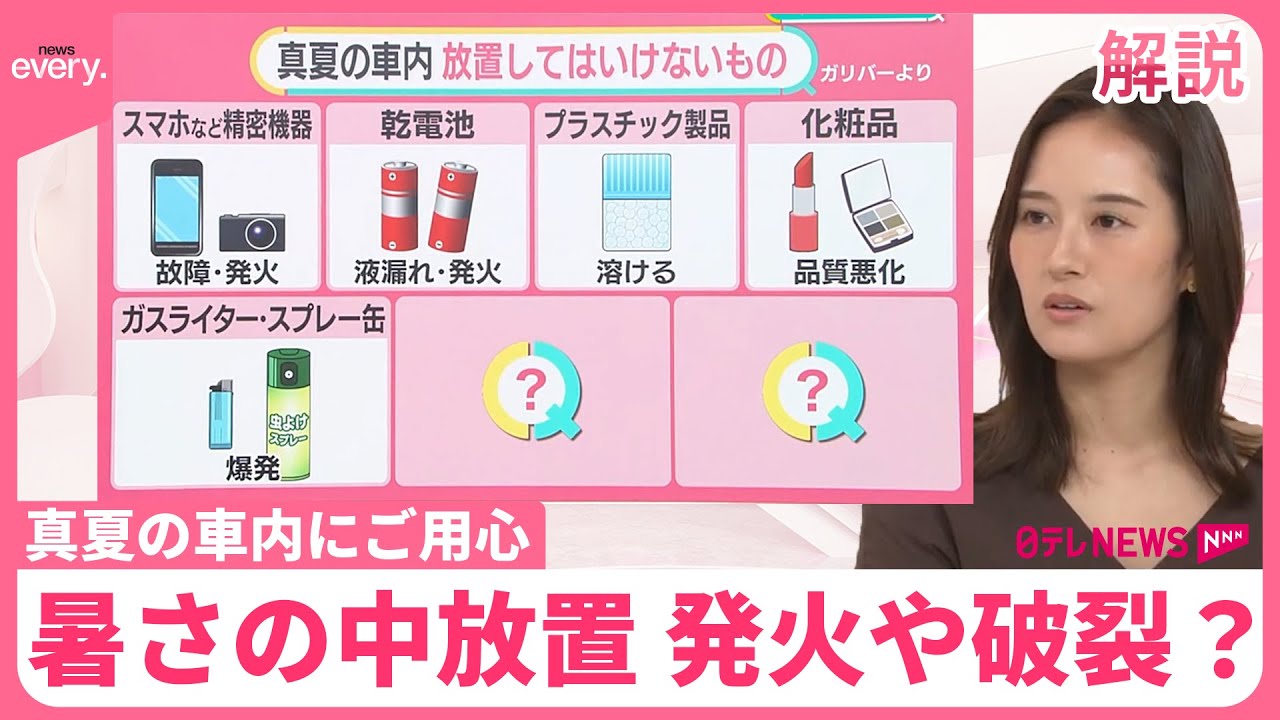 「プラスチック製品だと、カゴや芳香剤が溶けてしまうかもしれない。化粧品は品質が悪化する可能性もあるということです。ガスライターやスプレー缶については、日焼け止めや冷却のスプレーを置く人がいますが、爆発する可能性もあるそうです」