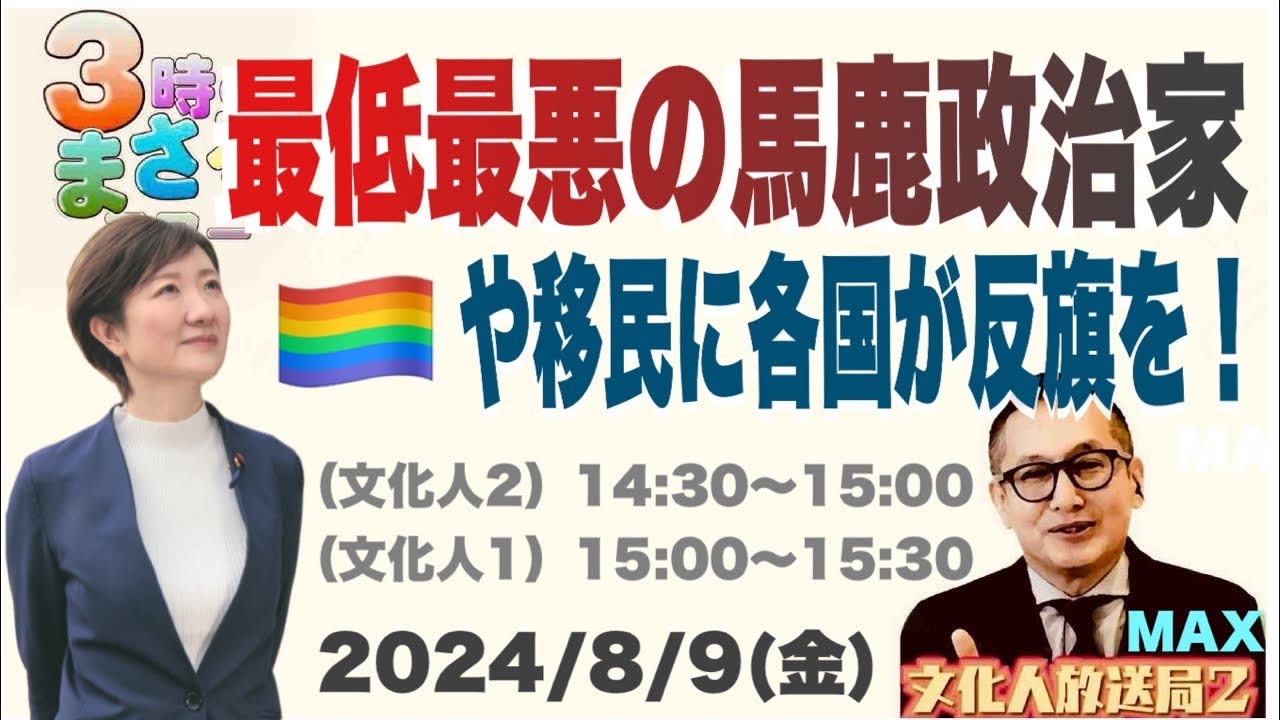 【最低・最悪の馬鹿政治家】LGBTや移民に各国が反旗を! 2024/8/9(金)文化人② 14:30~15:00『3時のまさるアワーMAX』