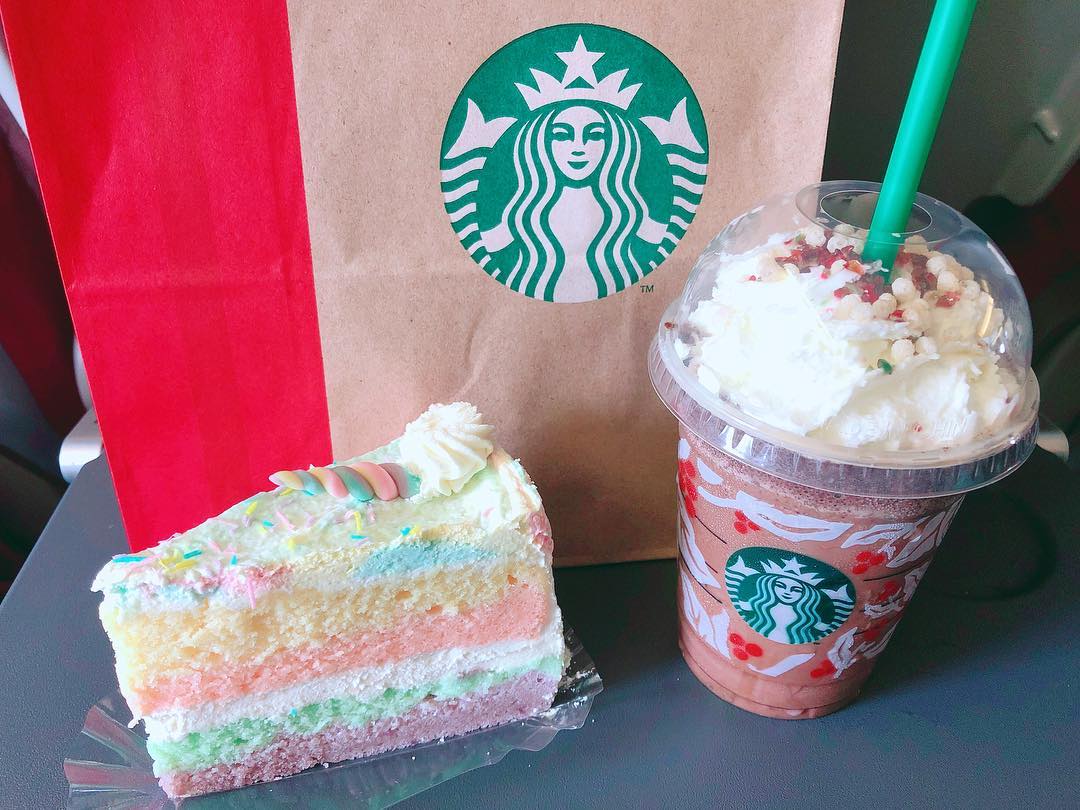 飛行機に乗る前にタイの空港のスタバで買った、ユニコーンケーキとフラペチーノ🍰🥤