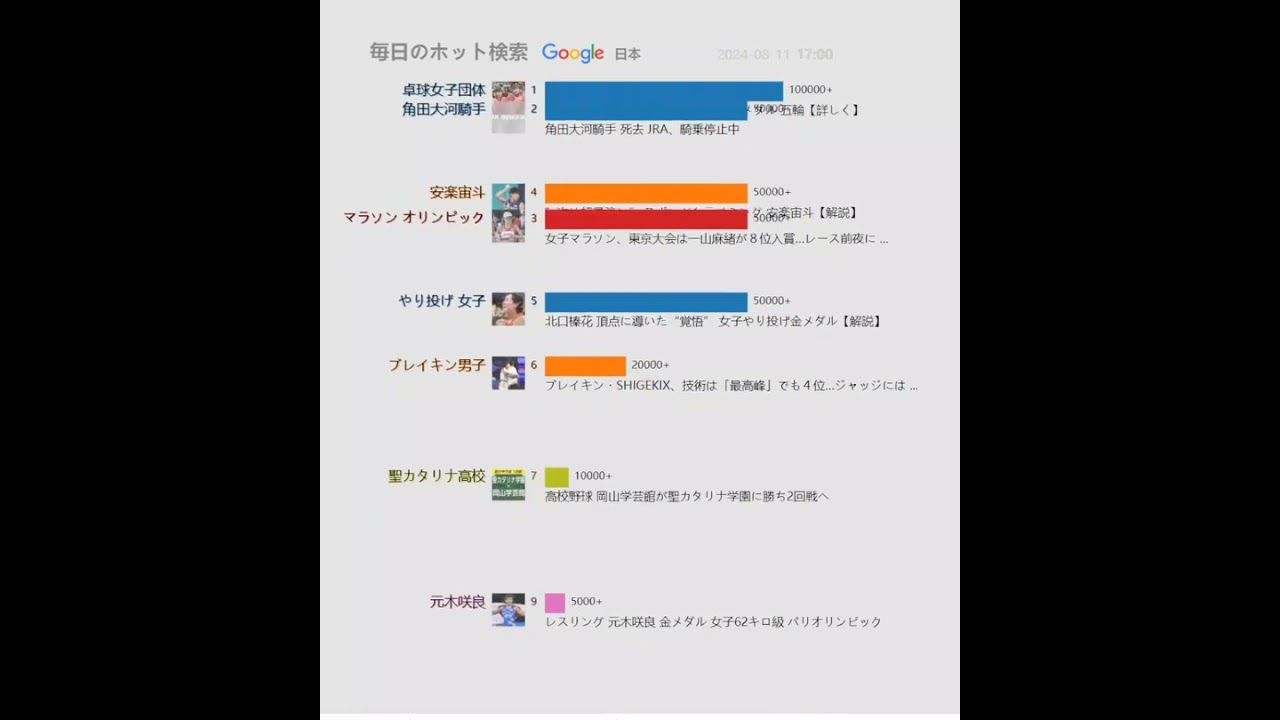 毎日のホット検索(日本)20240811 | 卓球 女子団体 日本が銀 4大会連続のメダル 五輪【詳しく】