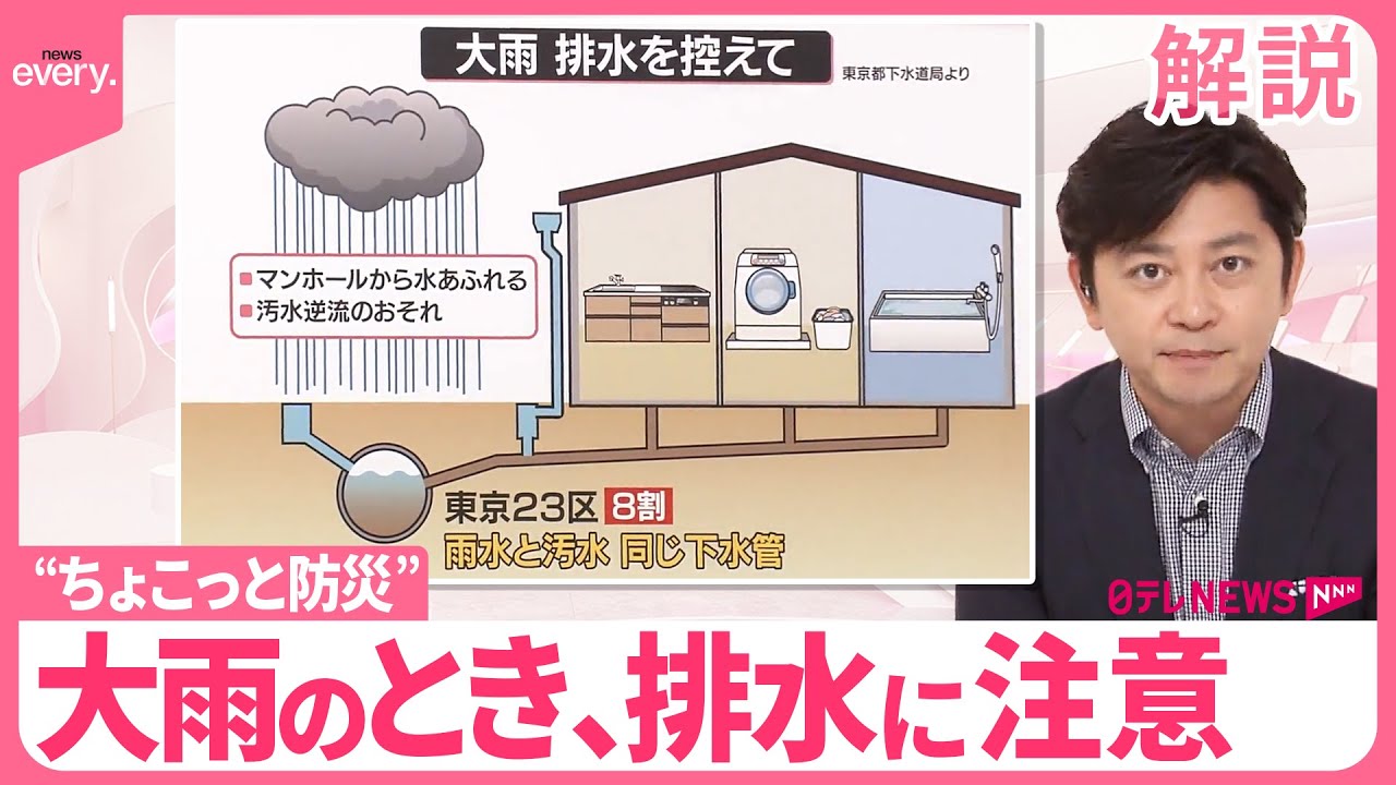 「news every.」では、毎日こつこつ、すぐできる防災のアイデア「ちょこっと防災」をお伝えします。22日は「大雨のとき、排水に注意」です。