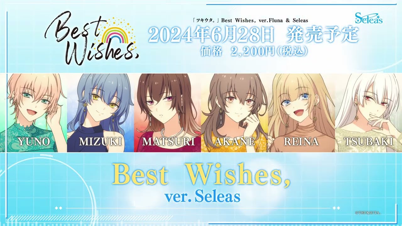 1年の各月をイメージしたキャラクターがそれぞれの月をイメージした楽曲を歌いドラマを演じるCDシリーズ『ツキウタ。』より、ツキプロ合同楽曲『Best Wishes,』を、FlunaとSeleas両ユニットの12名全員と、各ユニットごとで歌ったバージョンを収録したCD がリリース!