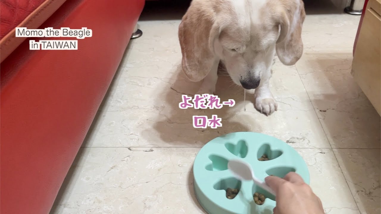 早食い防止用のご飯入れを試してみるビーグル犬モモ