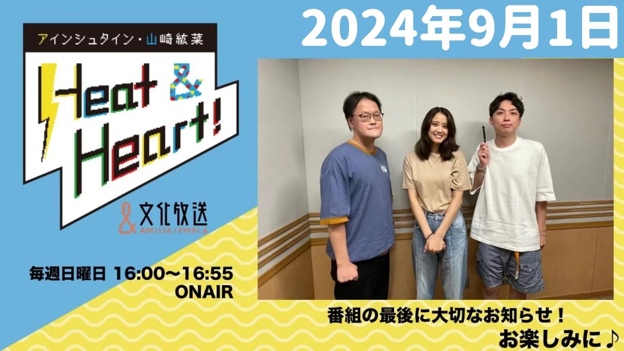 アインシュタイン・山崎紘菜 Heat&Heart! 2024年9月1日 『アインシュタイン・山崎紘菜 Heat&Heart!』2024年9月1日(日) ▼パーソナリティ アインシュタイン(稲田直樹・河井ゆずる)・山崎紘菜 #アインシュタイン #ラジオ actressRadio chアインシュタインアインシュタイン・山崎紘菜 Heat&Heart!ラジオ女優山崎紘菜 Write A Commentコメントを投稿するにはログインしてください。