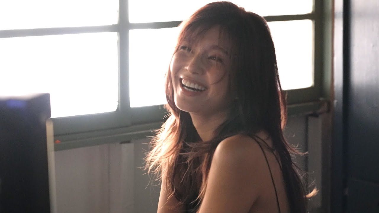 メイキングは、背中の広く開いた黒色のキャミソールワンピースを着こなした宇野さんが、笑顔で現れるところからスタート。