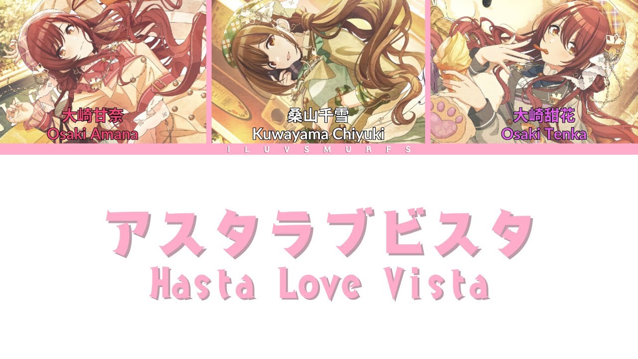 アスタラブビスタ(Hasta Love Vista) – sung by: 大崎甘奈 (Osaki Amana) – CV: 黒木ほの香 (Kuroki Honoka), 桑山千雪 (Kuwayama Chiyuki) – CV: 芝崎典子 (Shibasaki Noriko), and 大崎甜花 (Osaki Tenka) – CV: 前川涼子 (Maekawa Ryoko)